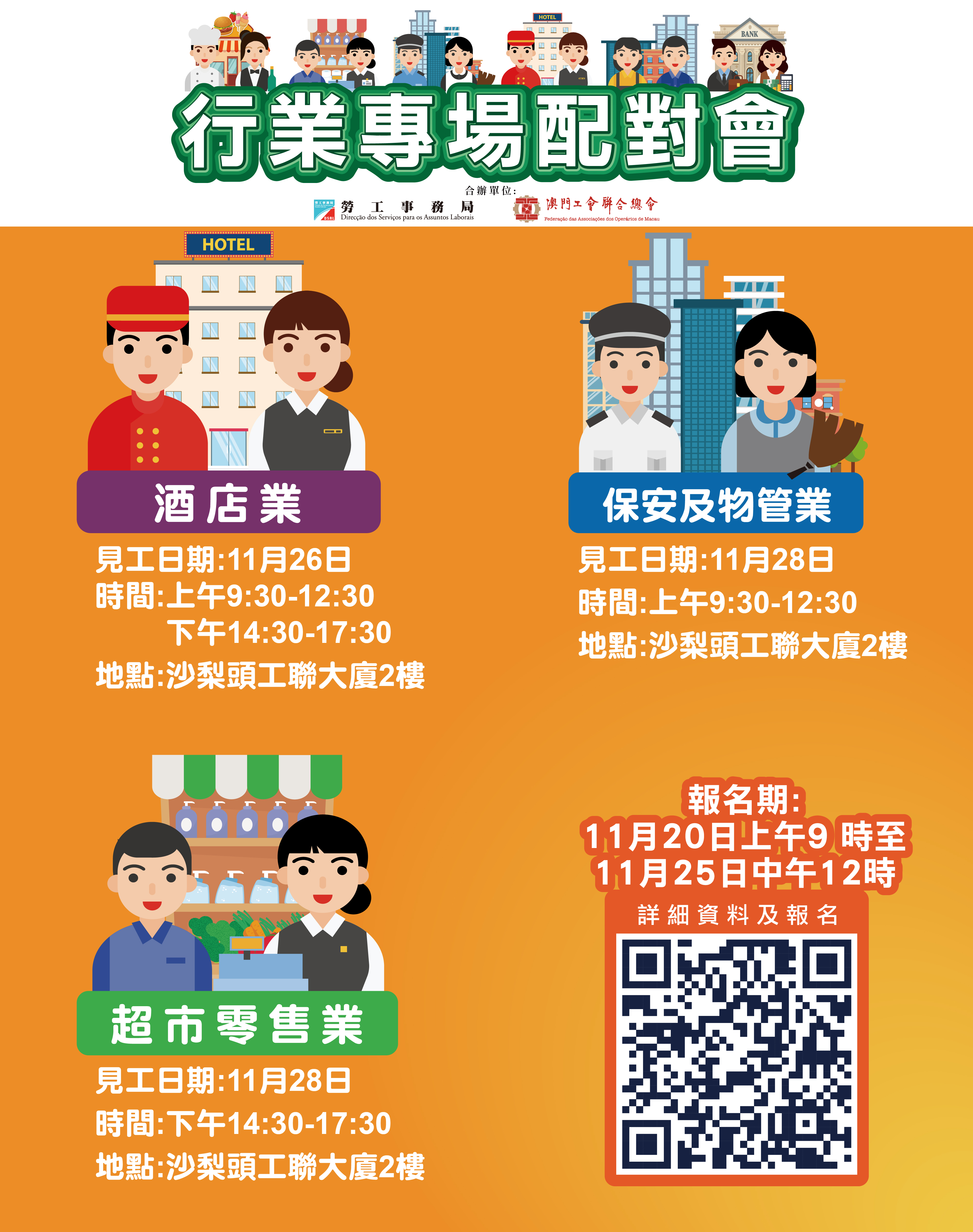 為協助有求職需求的澳門居民盡快就業,以及為緩解業界的人資需求壓力,勞工事務局與澳門工會聯合總會合作11月底舉辦3場行業專場配對會,合共提供502個空缺。報名日期為11月20日上午9時至11月25日中午12時。