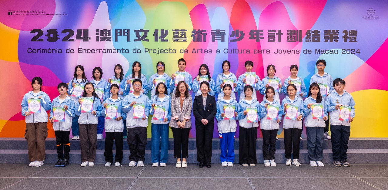 由文化局主辦的2024“澳門文化藝術青少年計劃”今日(11月23日)在澳門文化中心會議室舉行結業禮,文化局局長梁惠敏、中央人民政府駐澳門特別行政區聯絡辦公室宣傳文化部處長王惠杰、教育及青年發展局青年試館主任柯敏茵,文化局澳門博物館館長盧可茵、文化傳播處處長梁靜儀,課程導師李淑儀、胡淑華、簡佩茵、黃碩瑩、葉志堅及孫嘉鳴出席。第二屆學員在一眾嘉賓、導師及家長們見證下獲頒證書及襟章,宣誓成為“文化局學生文化大使”。第一屆學員則獲頒“熱心參與奬”,兩屆共60位學員將繼續並肩參與更多文化藝術學習旅程。