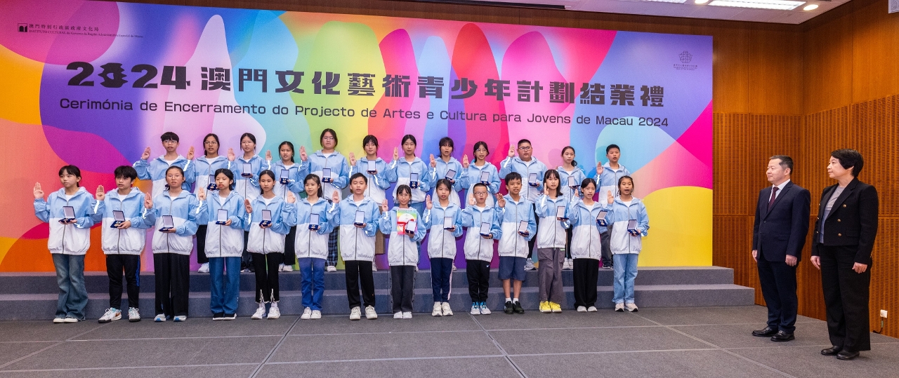 由文化局主辦的2024“澳門文化藝術青少年計劃”今日(11月23日)在澳門文化中心會議室舉行結業禮,文化局局長梁惠敏、中央人民政府駐澳門特別行政區聯絡辦公室宣傳文化部處長王惠杰、教育及青年發展局青年試館主任柯敏茵,文化局澳門博物館館長盧可茵、文化傳播處處長梁靜儀,課程導師李淑儀、胡淑華、簡佩茵、黃碩瑩、葉志堅及孫嘉鳴出席。第二屆學員在一眾嘉賓、導師及家長們見證下獲頒證書及襟章,宣誓成為“文化局學生文化大使”。第一屆學員則獲頒“熱心參與奬”,兩屆共60位學員將繼續並肩參與更多文化藝術學習旅程。