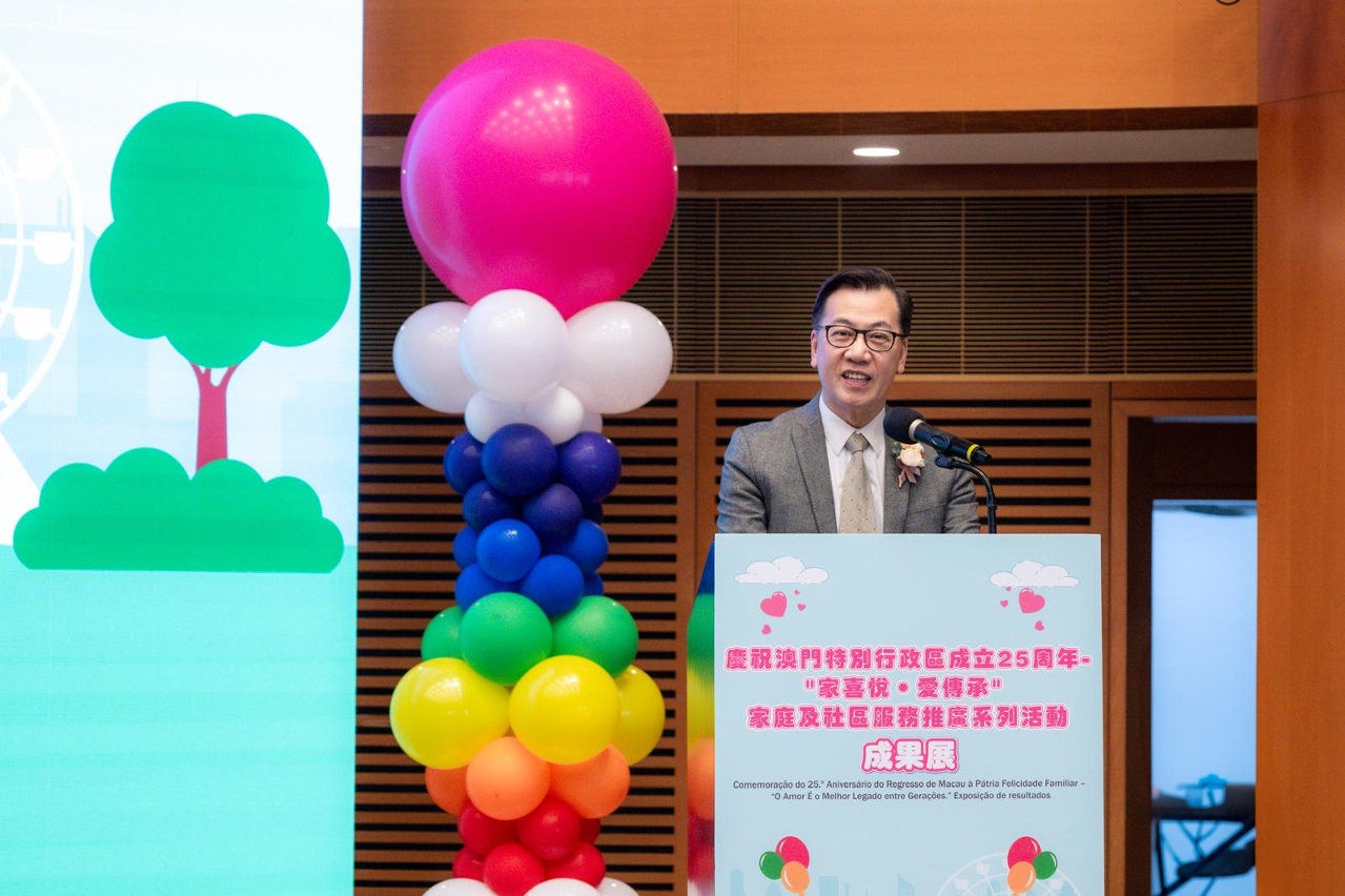 2024年為國際家庭年30周年及澳門特別行政區成立25周年,社會工作局聯同澳門工會聯合總會、聖公會澳門社會服務處,以及6個“分區協作聯網”共40多間社服機構,於今(24)日假澳門科學館會議廳舉辦慶祝澳門特別行政區成立25周年 -“家喜悅‧愛傳承”家庭及社區服務推廣系列活動成果展,由社會工作局鄧玉華副局長、中央人民政府駐澳門特別行政區聯絡辦公室社會工作部趙河清副部長、教育及青年發展局蔡敏芝代副局長、法務局行政及財政管理廳李勝里廳長、文化局讀者服務及推廣處林穎娜處長、衛生局余斌護士長、澳門工會聯合總會張國然副會長、聖公會澳門社會服務處葉鑑波服務總監主持啟動儀式。現場設有親子沉浸式互動劇場、時光走廊體驗、圖畫填色攤位、家庭教育成品展示、吉祥物拍照,以及活動主題微電影“以愛連城”首映等,共有800人次參與。