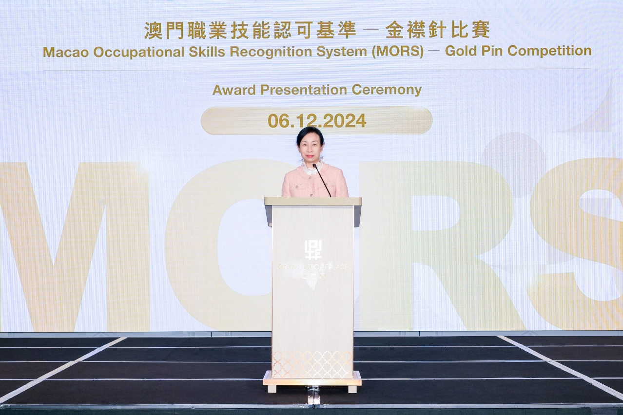 澳門旅遊大學於2024年12月6日假澳門上葡京綜合度假村舉行“澳門職業技能認可基準(MORS)"(以下簡稱MORS)2024金襟針大賽頒獎典禮,出席頒獎典禮的嘉賓包括澳門特區政府勞工事務局局長黃志雄、旅遊局副局長程衛東、澳娛綜合度假股份有限公司首席企業事務總監沈銘義、勞工事務局職業培訓廳廳長張瑋、澳門酒店協會會長王淑欣及澳門酒店旅業職工會會長李寶來。