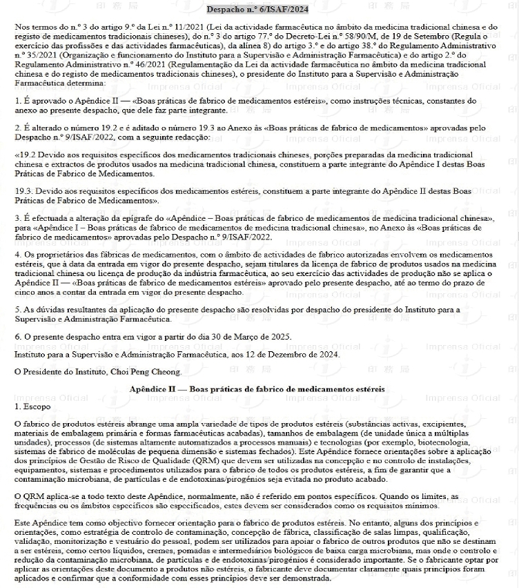 為強化藥物全生命周期管理,並配合澳門經濟適度多元發展,藥物監督管理局於2024年12月26日頒佈《藥物臨床試驗質量管理規範(GCP)》及《無菌藥物生產質量管理規範》兩項技術性指示。上述兩項技術性指示將於2025年3月30日起生效,而現有正從事無菌藥物生產活動的本澳製藥廠,設有5年過渡期以過渡至新規範的要求。
