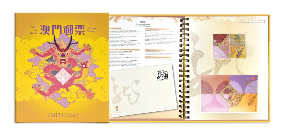 年冊載有2024年發行的12套郵票、1套自動黏貼郵票和12枚小型張,內頁以活頁形式呈現精美的澳門郵品,並印有相關郵品的彩圖和技術資料。
