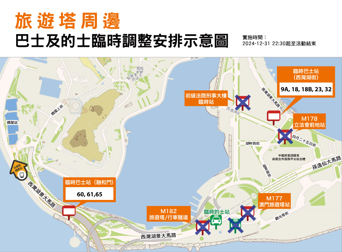 除夕夜,本澳多處將舉行除夕倒數活動,旅遊塔周邊、氹仔及路氹連貫公路將實施臨時交通安排(詳見附表),多條巴士路線需改道行駛及調整停靠站點。其中,靠近旅遊塔方面,初級法院刑事大樓臨時站、“立法會前地"站、“澳門旅遊塔"站及“旅遊塔/行車隧道"站於12月31日(周二)晚上10時30分起臨時停用,9A、18、18B、23、32路線可選擇於西灣湖街臨時巴士站上落客;60、61及65(往司打口)路線改於融和門附近之臨時站上落客;65(往牧場街)路線可選擇於“西灣湖景大馬路/媽閣交通樞紐"站上落客;26路線在上述期間也不停靠旅遊塔周邊站點,乘客需改於“西灣湖景大馬路/媽閣碼頭"站或“西灣湖景大馬路/媽閣交通樞紐"站搭乘有關路線;6B路線需改道行駛,停靠站點維持不變。此外,對於旅遊塔一帶在活動散場時前往青茂口岸的出行需要,建議乘客於西灣湖街搭乘9A及23路線。
