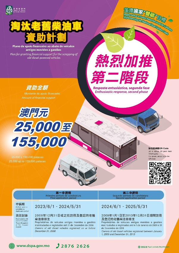 《淘汰老舊柴油車資助計劃》的第二申請期資助對象為2009年1月1日至2013年12月31日期間註冊及登記的老舊柴油車車主,但不包括於2023年5月22日或之後重新註冊的老舊柴油車。按照有關車輛的分類及規格,可獲批給的資助金額由澳門元二萬五千元至十五萬五千元。