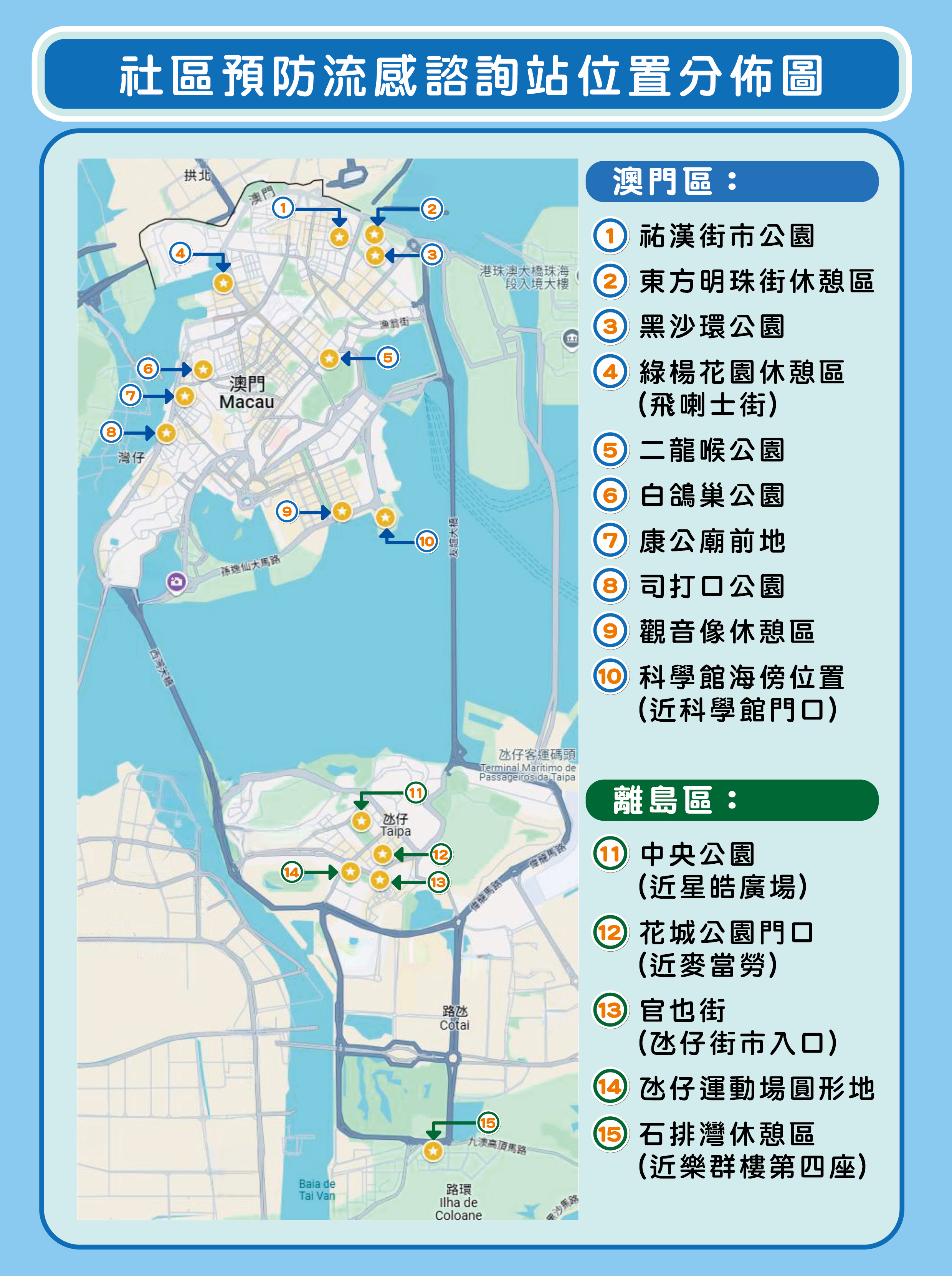 本澳已進入流感高峰期,預期流感病毒將活躍至2月,為應對流感高峰期及春節假期因居民外遊或社交活動頻繁而增加流感的傳播,衛生局與社團和醫療機構攜手合作,於本周六日(1月18及19日),在全澳各區設置15個“社區預防流感諮詢站”,加強向居民進行宣傳教育,提升防範流感認識。