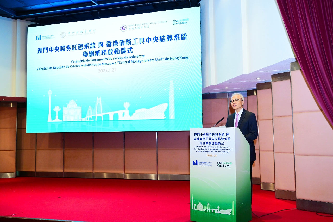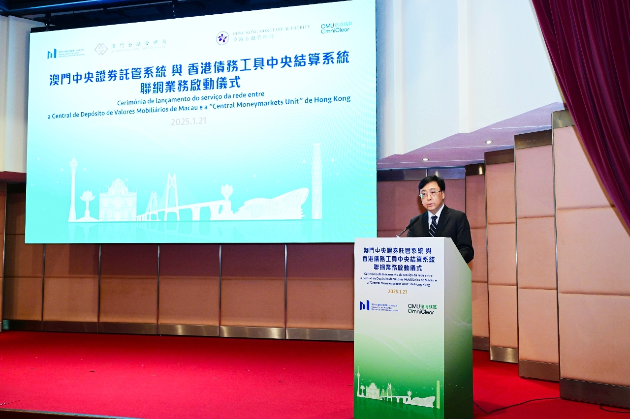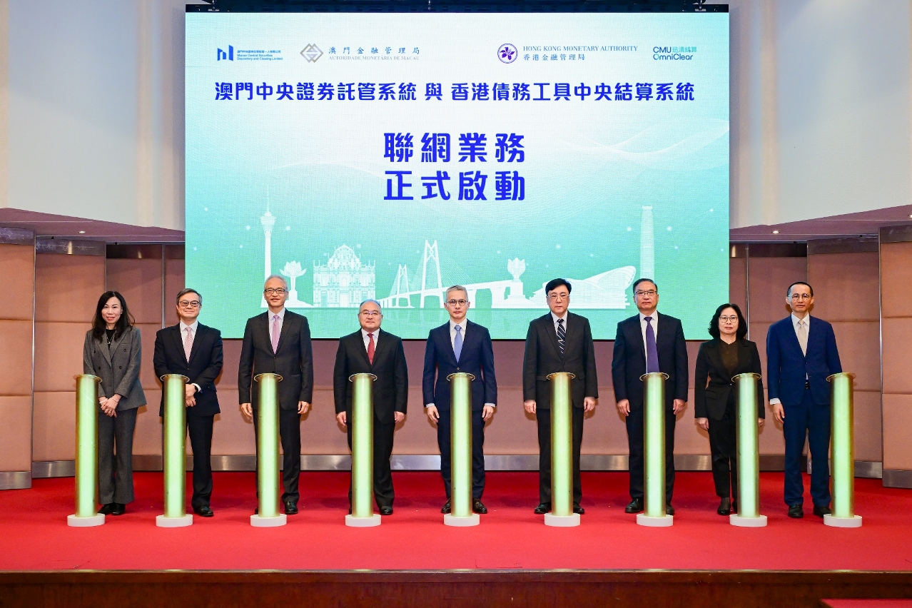 在澳門金融管理局(澳門金管局)和香港金融管理局(香港金管局)的支持下,澳門中央證券託管結算一人有限公司(MCSD)與迅清結算有限公司(迅清結算)共同主辦的“澳門中央證券託管系統(CSD)與香港債務工具中央結算系統(CMU)聯網業務啟動儀式”於今(21)日圓滿舉行。