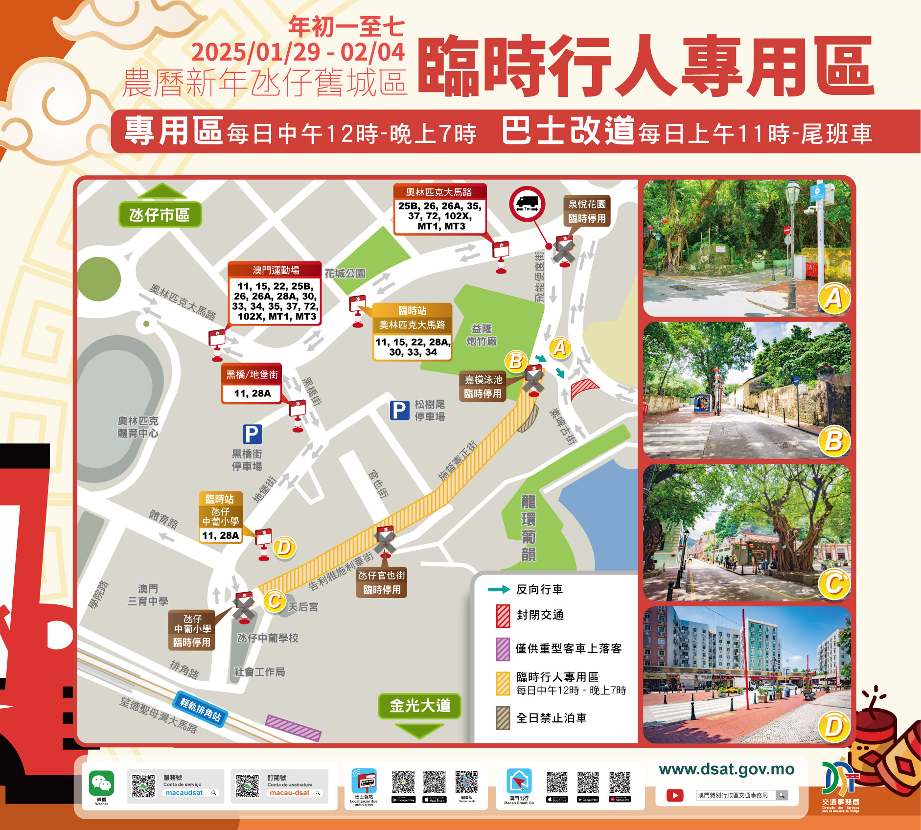 新春期間除氹仔舊城區外,各陸路口岸、新馬路及周邊區域亦實施多項臨時交通措施,以及因應大型節慶活動,公共巴士、輕軌服務均採取臨時服務調整,詳情可瀏覽局方網站(https://www.dsat.gov.mo/dsat/news_detail.aspx?a_id=62013F058D4045A14A6CA8302A397F49),以及透過“澳門出行”、“巴士報站”APP及官方微信公眾號了解最新交通資訊。