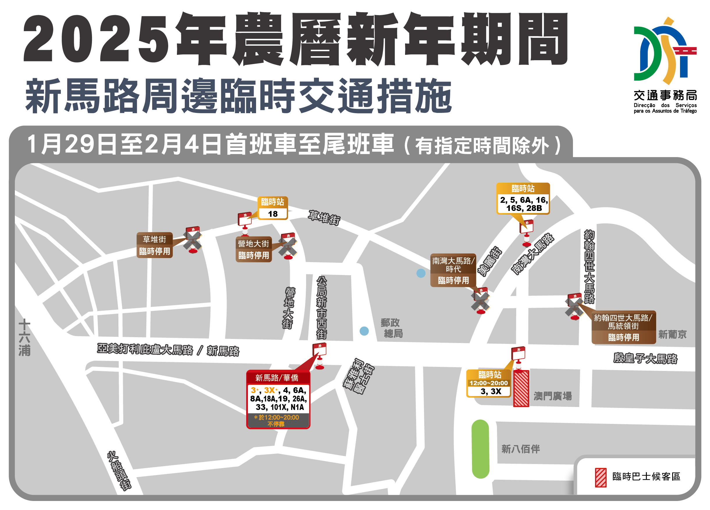 為應對農曆新年期間居民及來澳旅客歡度新歲的出行需要,交通事務局經與多方協調,對預計有大量人流及車流集結的地點推出臨時措施,以減少人車擁擠出現的潛在風險。