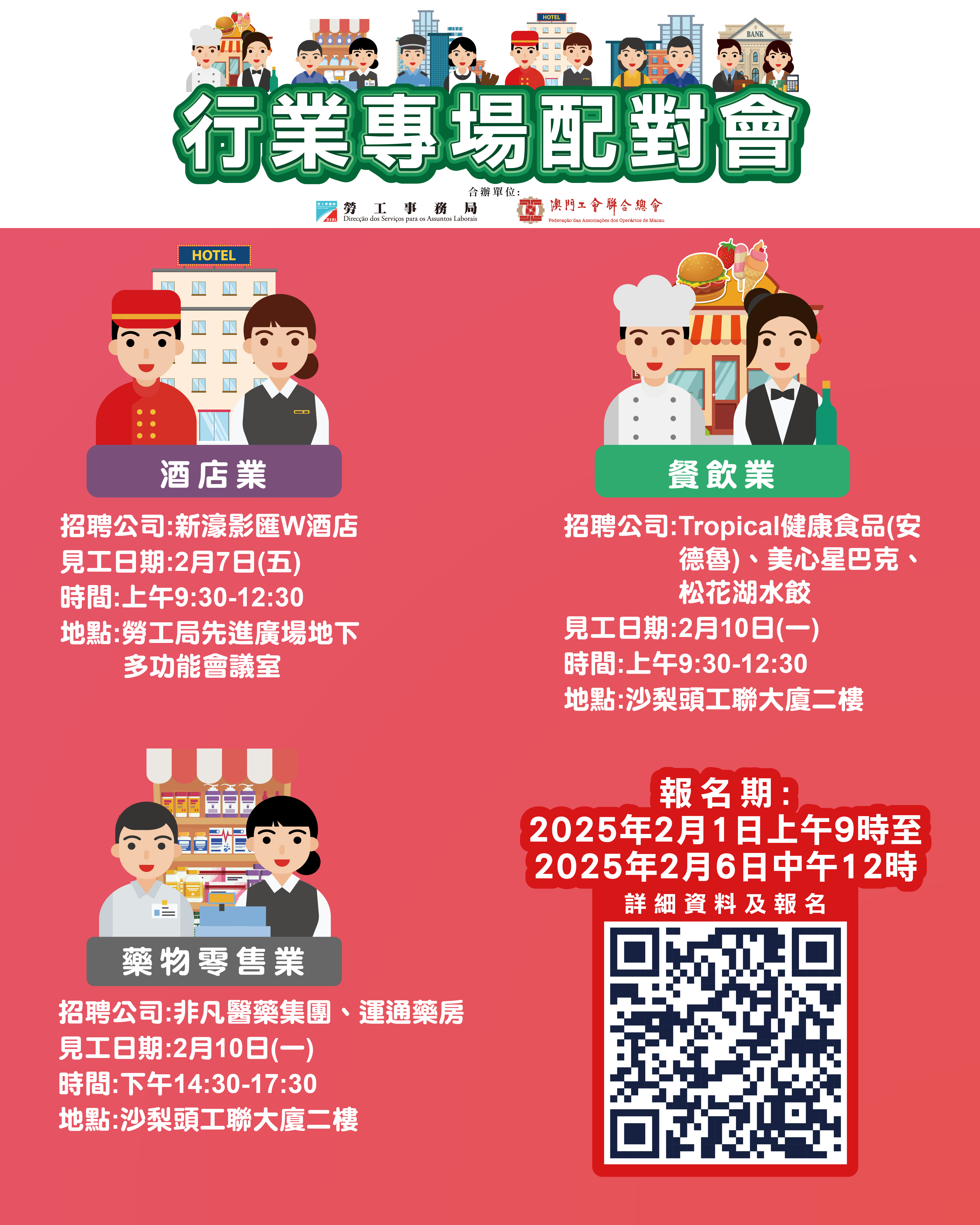 2月7日上午酒店業專場配對會在澳門勞工事務局地下多功能會議室(澳門馬揸度博士大馬路221-279號先進廣場大廈)舉行;2月10日上午餐飲業專場配對會及下午藥物零售業專場配對會在澳門工會聯合總會二樓(沙梨頭海邊街2-6號工聯大廈)舉行。報名日期為2月1日上午9時至2月6日中午12時。