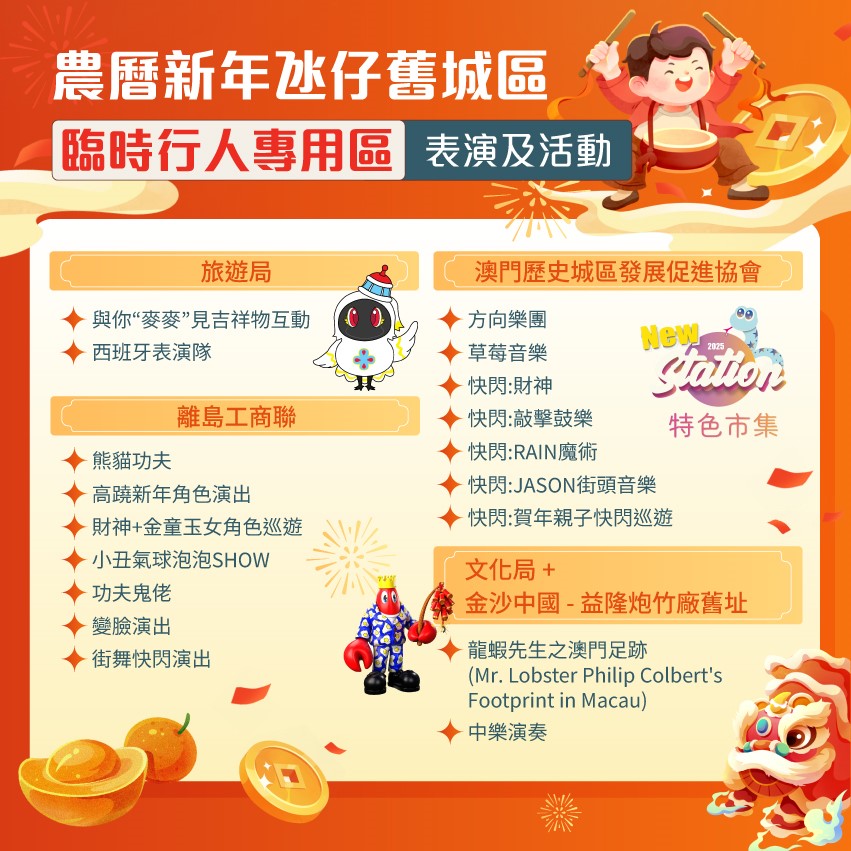 此外,為增新春節日氣氛及玩樂元素,行人專用區內安排了一系列活動及表演供巿民及旅客參與,如在飛能便度街露天停車場設有特色市集、在不同地點將有新春角色巡遊、樂隊演奏等,詳情請參閱網上專頁(https://www.dsedt.gov.mo/taipaPedestrianZone)內介紹。