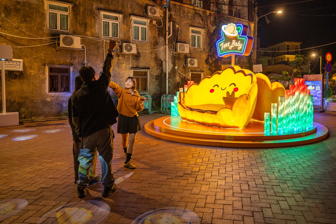 路環擁有古樸的漁村情懷,更有熱騰騰的馳名葡撻,古樸氛圍與地道美食招徠不少旅客到訪。“2024幻彩耀濠江”路環展區的分支主題為“漁光葡影”,透過1個旗艦裝置、1個互動裝置及3個燈飾裝置盡顯澳門悠閒氣色。