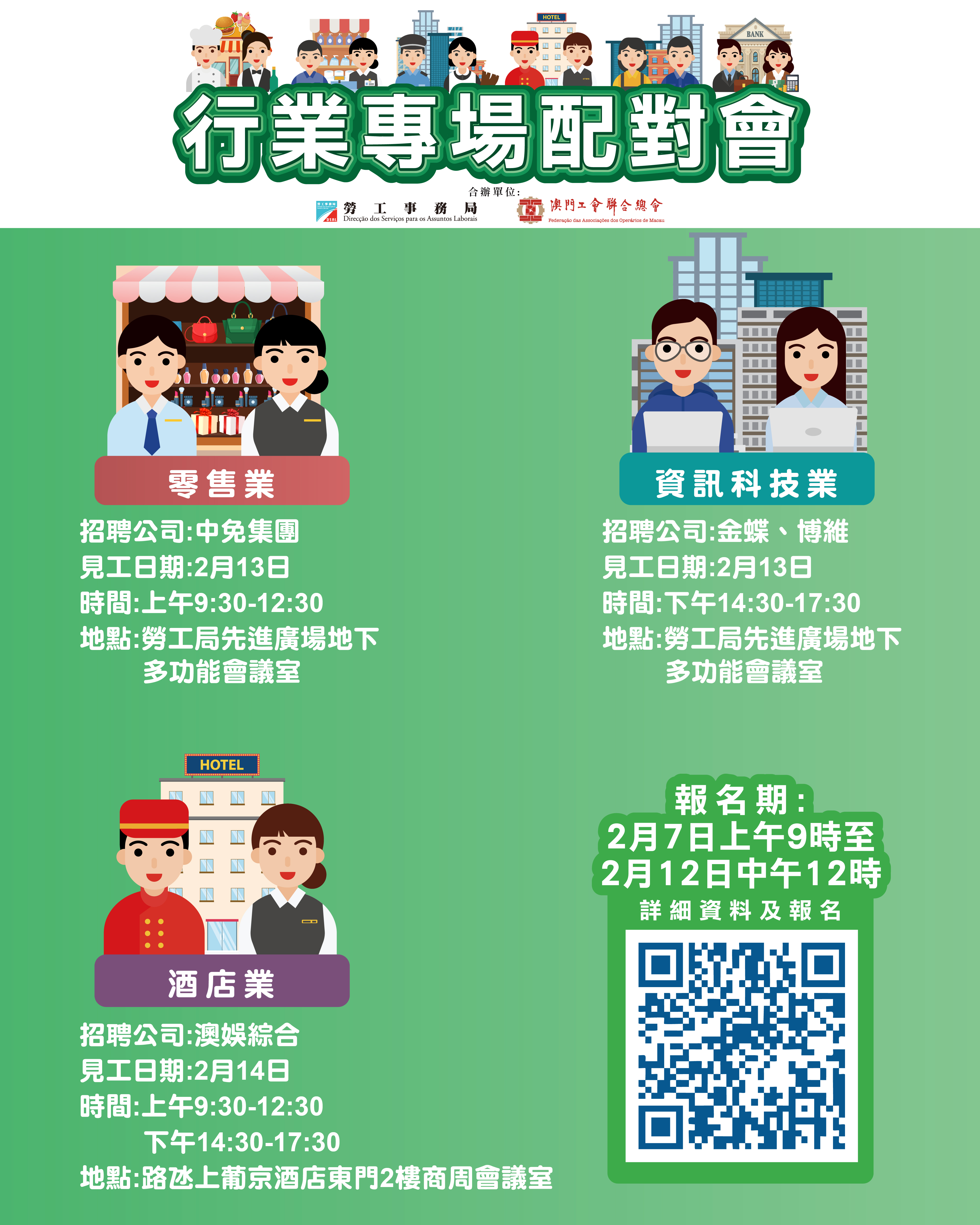 2月13日上午零售業專場配對會及下午資訊科技業專場配對會在澳門勞工事務局地下多功能會議室(澳門馬揸度博士大馬路221-279號先進廣場大廈)舉行;2月14日全日酒店業專場配對會在澳門上葡京二樓商周會議室舉行。報名日期為2月7日上午9時至2月12日中午12時。