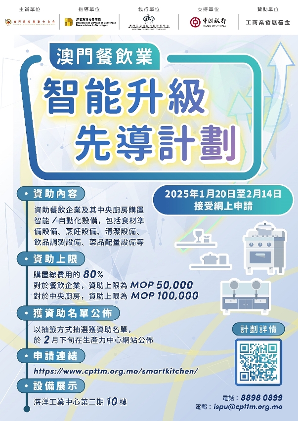 有關章程、線上申請流程以及設備清單,可在網上查閱(https://www.cpttm.org.mo/smartkitchen/)。如有疑問,可於辦公時間內透過電話(8898 0899,戴先生或譚先生)、電郵(ispu@cpttm.org.mo),或親臨該中心總辦事處(新口岸上海街175號中華總商會大廈6樓)查詢。