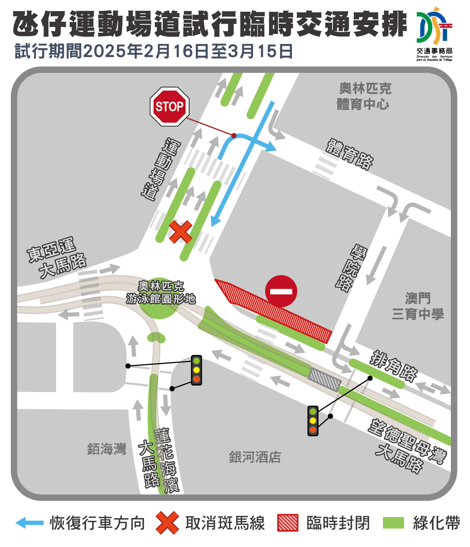 為提升周邊道路疏導能力,2月16日至3月15日臨時試行恢復運動場道往奧林匹克游泳館圓形地及運動場道(往運動場圓形地方向)右轉至體育路的行車安排,而位於運動場道與學院路之間的一段排角路將臨時封閉,運動場道鄰近奧林匹克游泳館圓形地的斑馬線亦會暫停使用,市民可使用運動場道鄰近體育路的斑馬線。(具體請查閱附圖3)。