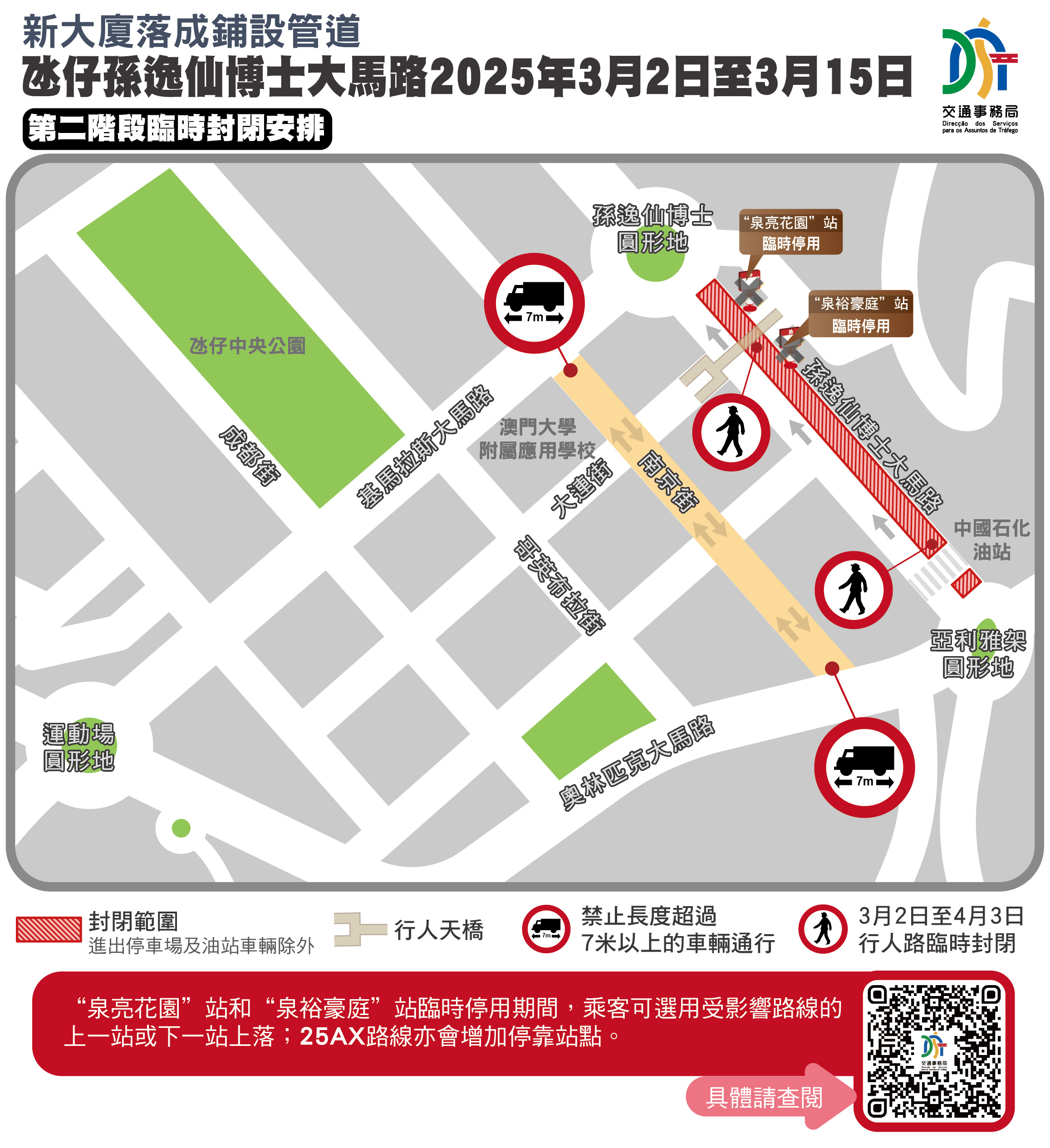 因應有新大廈落成須進行工程連接管道,介乎亞利雅架圓形地與孫逸仙博士圓形地的一段氹仔孫逸仙博士大馬路自2月13日起實施臨時交通措施,並於2月15日至3月15日期間分階段實施封閉交通,24條巴士線受影響。
