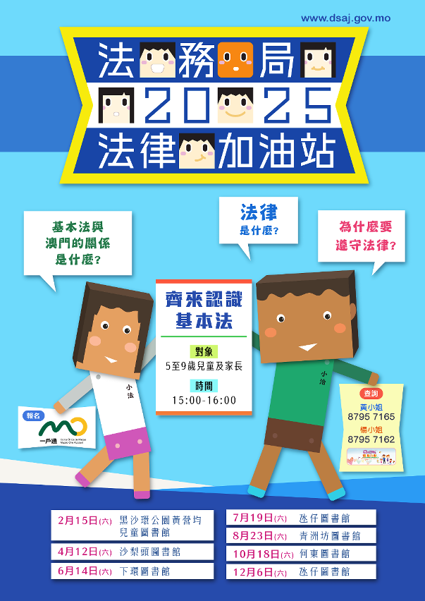 首場“法律加油站”已於2月順利舉行,其餘的場次將分別於4月12日、6月14日、7月19日、8月23日、10月18日和12月6日舉行。歡迎本澳5至9歲兒童及家長參加,活動已納入“百分百家長獎勵計劃”。有興趣者可透過一戶通的“活動報名”頁面報名,每場名額10對親子,如報名人數超過限額,將以電腦抽籤方式決定,詳情請參閱活動海報。如有任何查詢,歡迎致電法務局公共關係處黃小姐或楊小姐(8795 7165 / 8795 7162)。