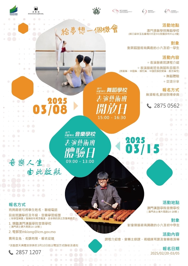 兩項活動現場將設有2025/2026學年中學教育“表演藝術班”的諮詢講解及即場報名,查詢可致電2875 0562(舞蹈學校)及2857 1207(音樂學校)。