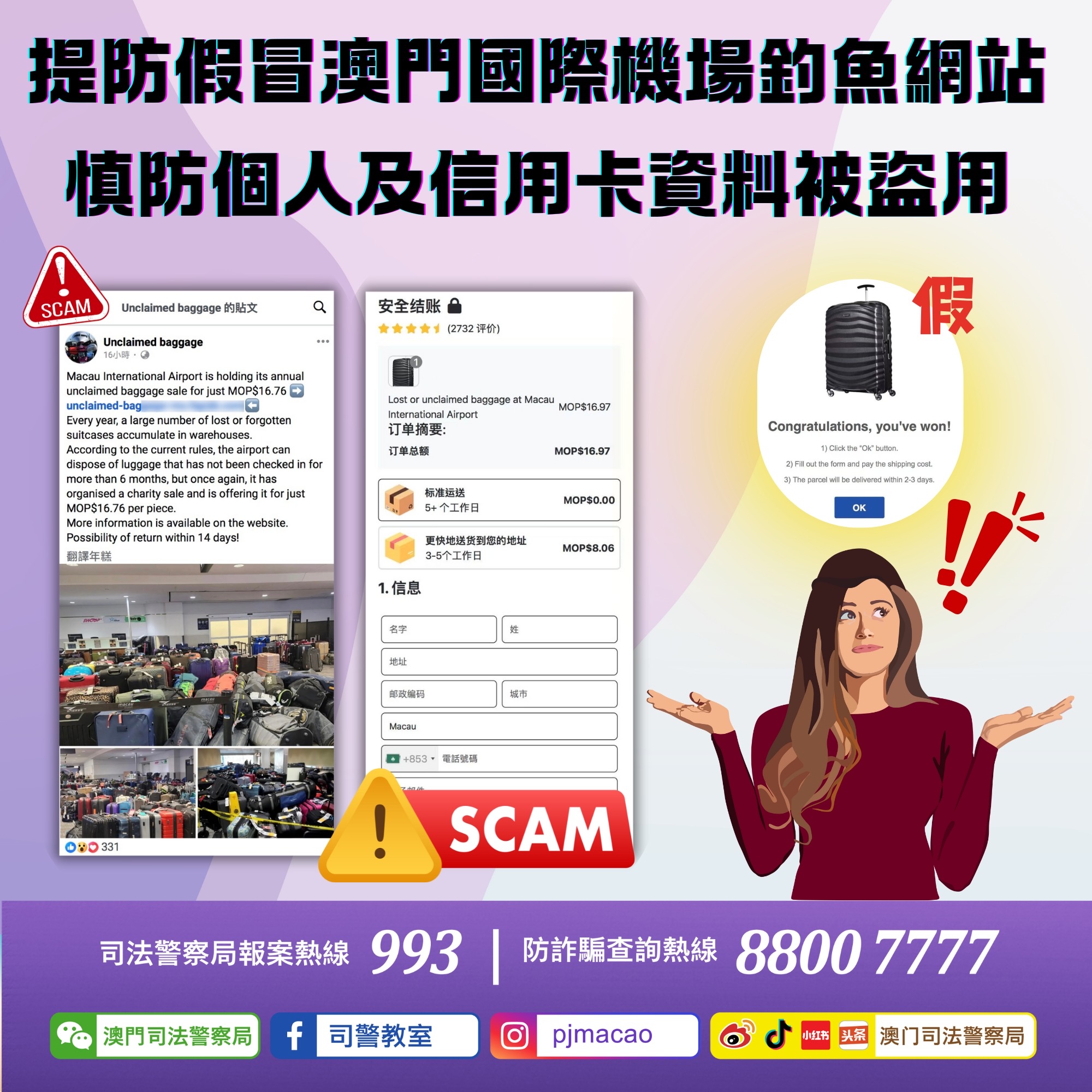 司警局今日接獲澳門國際機場專營股份有限公司(CAM)通報,指有人於Facebook社交平台發表虛假帖文,內容聲稱“澳門國際機場”正在進行無人認領行李的年度特賣,每件僅售16.76澳門元。