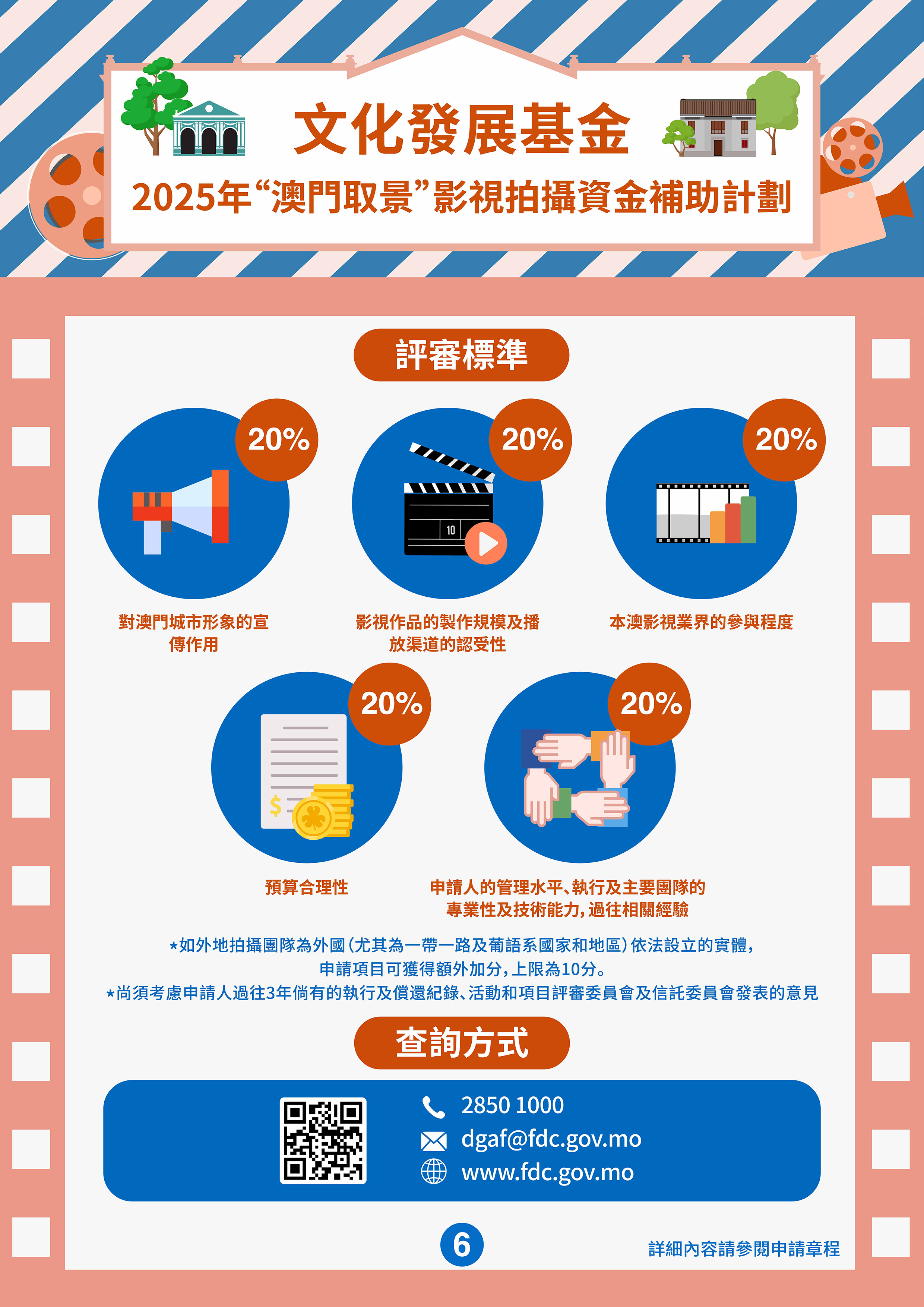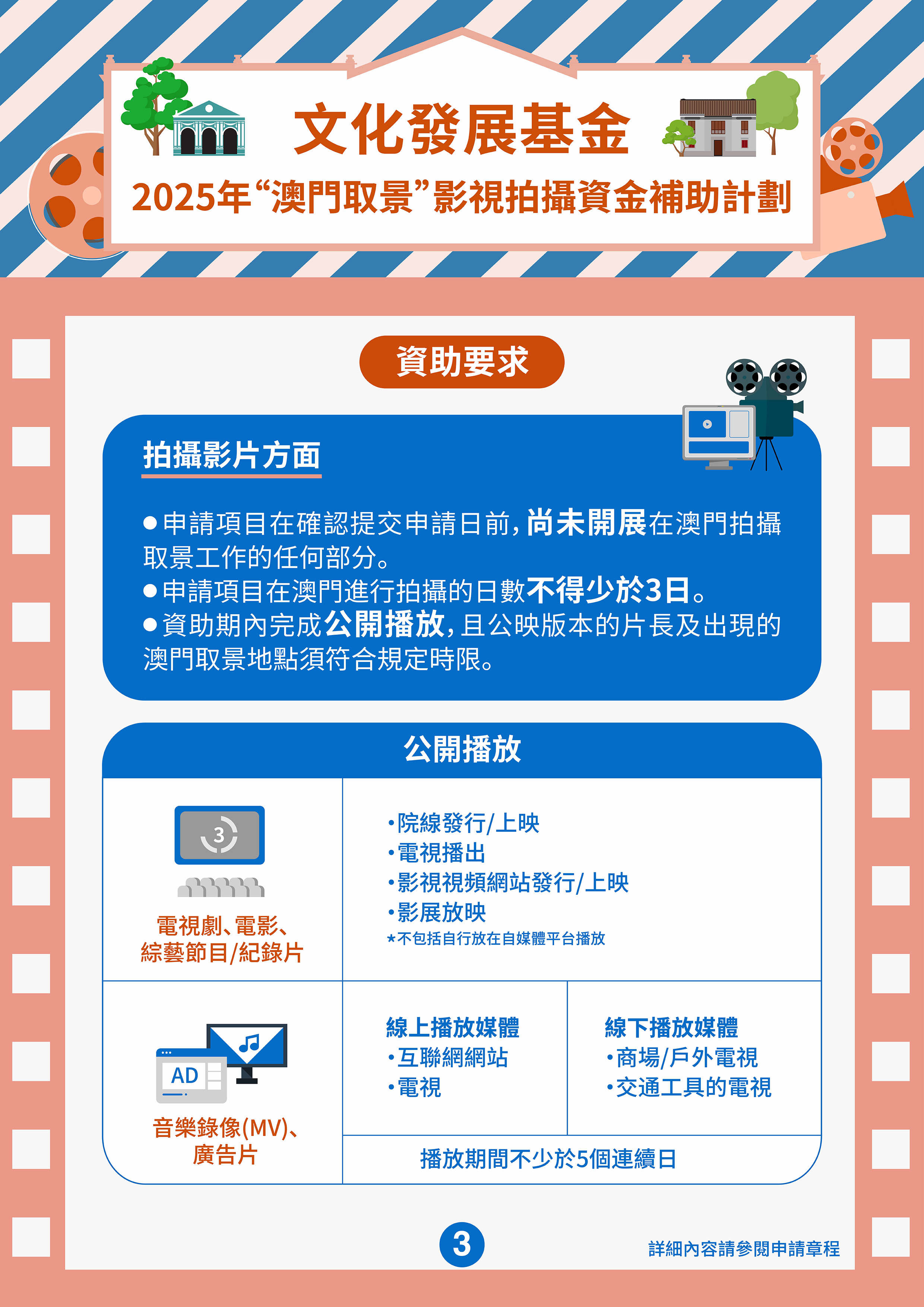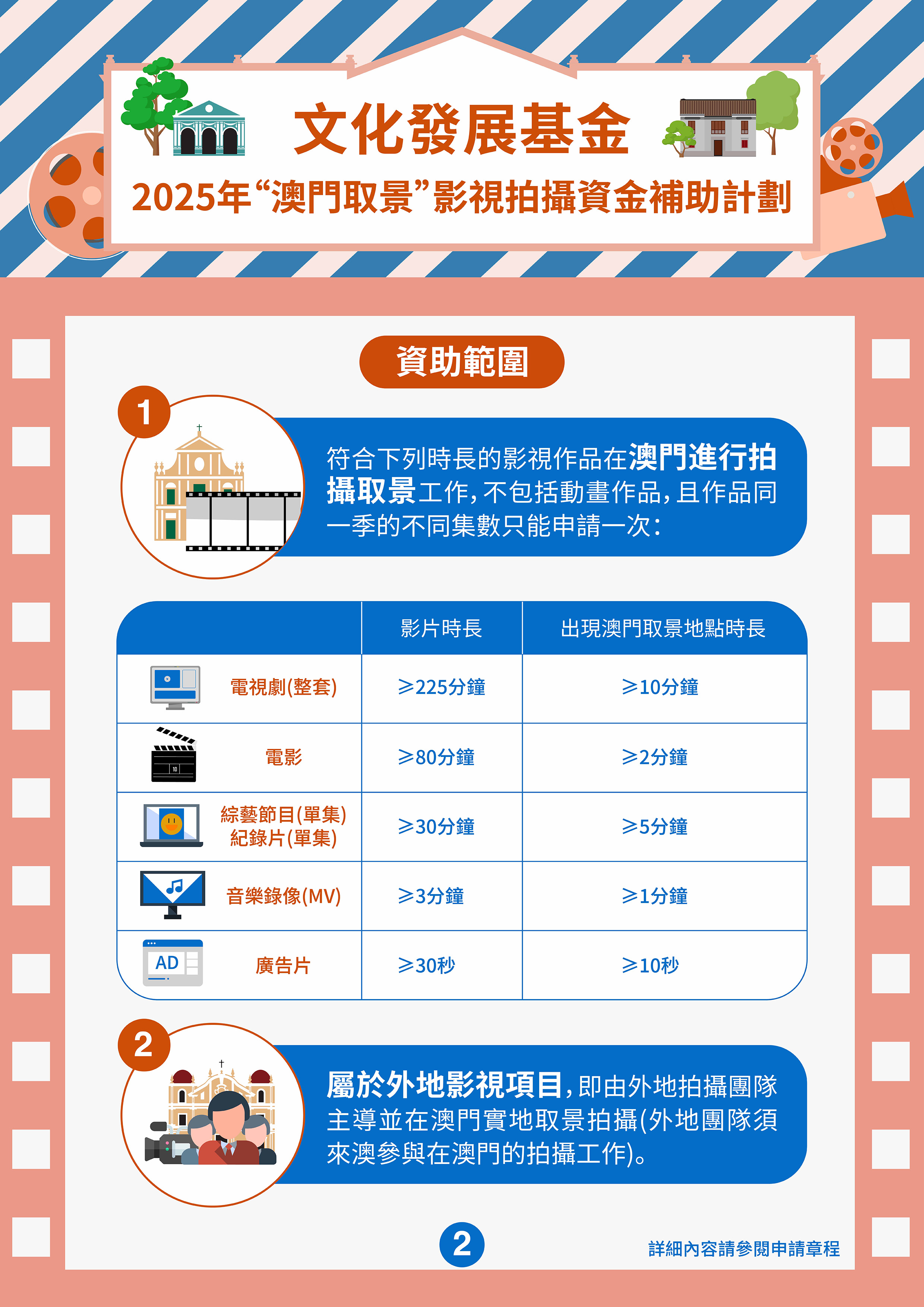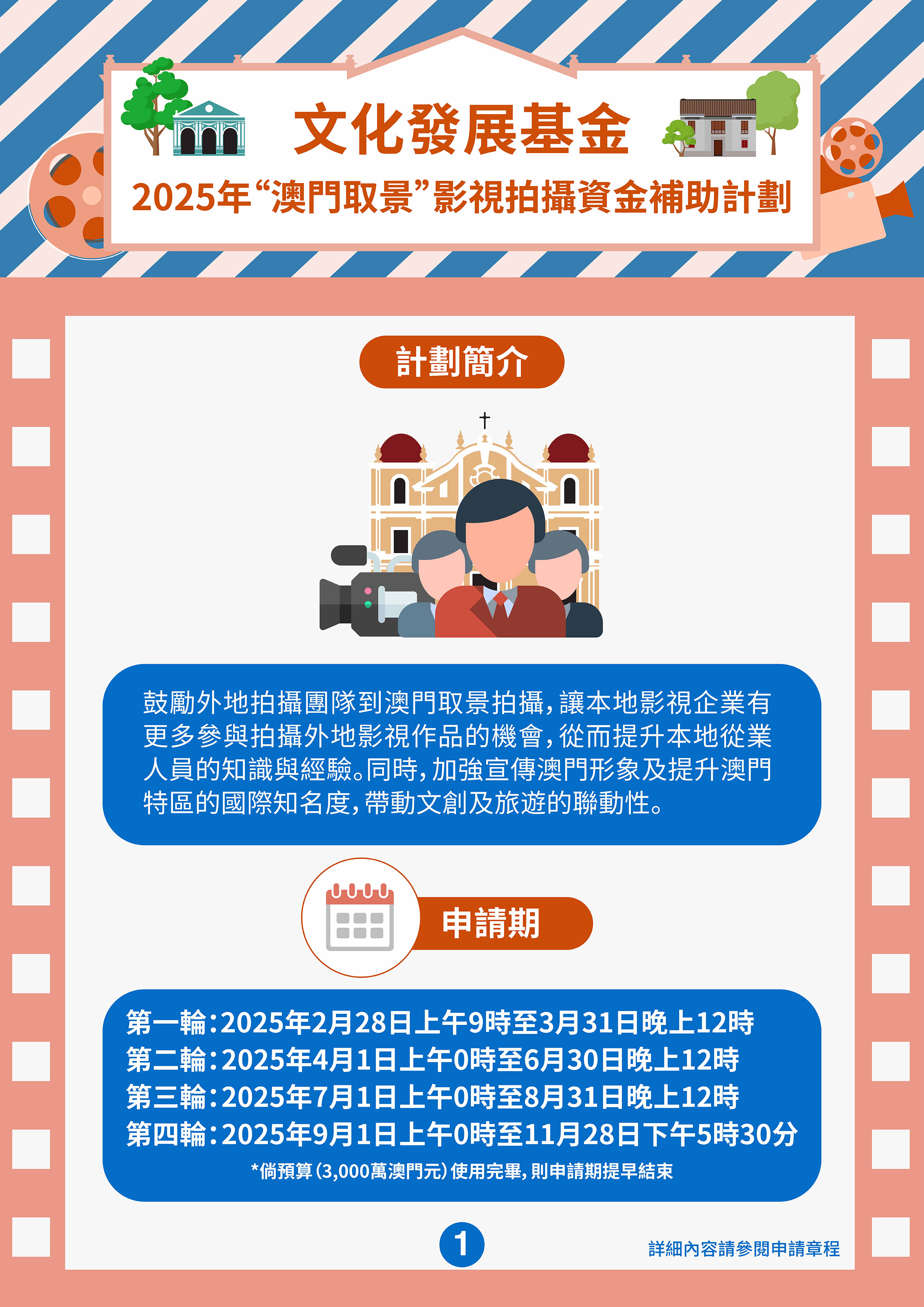 今年將推出四輪申請,第一輪申請期由2025年2月28日至3月31日,倘預算使用完畢,則申請期提早結束。資助計劃接受在確認提交申請日前尚未開展在澳門取景拍攝工作,且在澳拍攝的日數不少於3天的外地影視項目,由外地拍攝團隊主導並來澳參與拍攝工作。資助申請須由作為澳門製片單位的澳門商業企業主提出,其所營事業須與影視製作相關。獲資助的影視項目須在資助期內完成公開播放,且公映版本的片長及片中出現澳門取景地點的時長,須符合章程規定的時限要求。