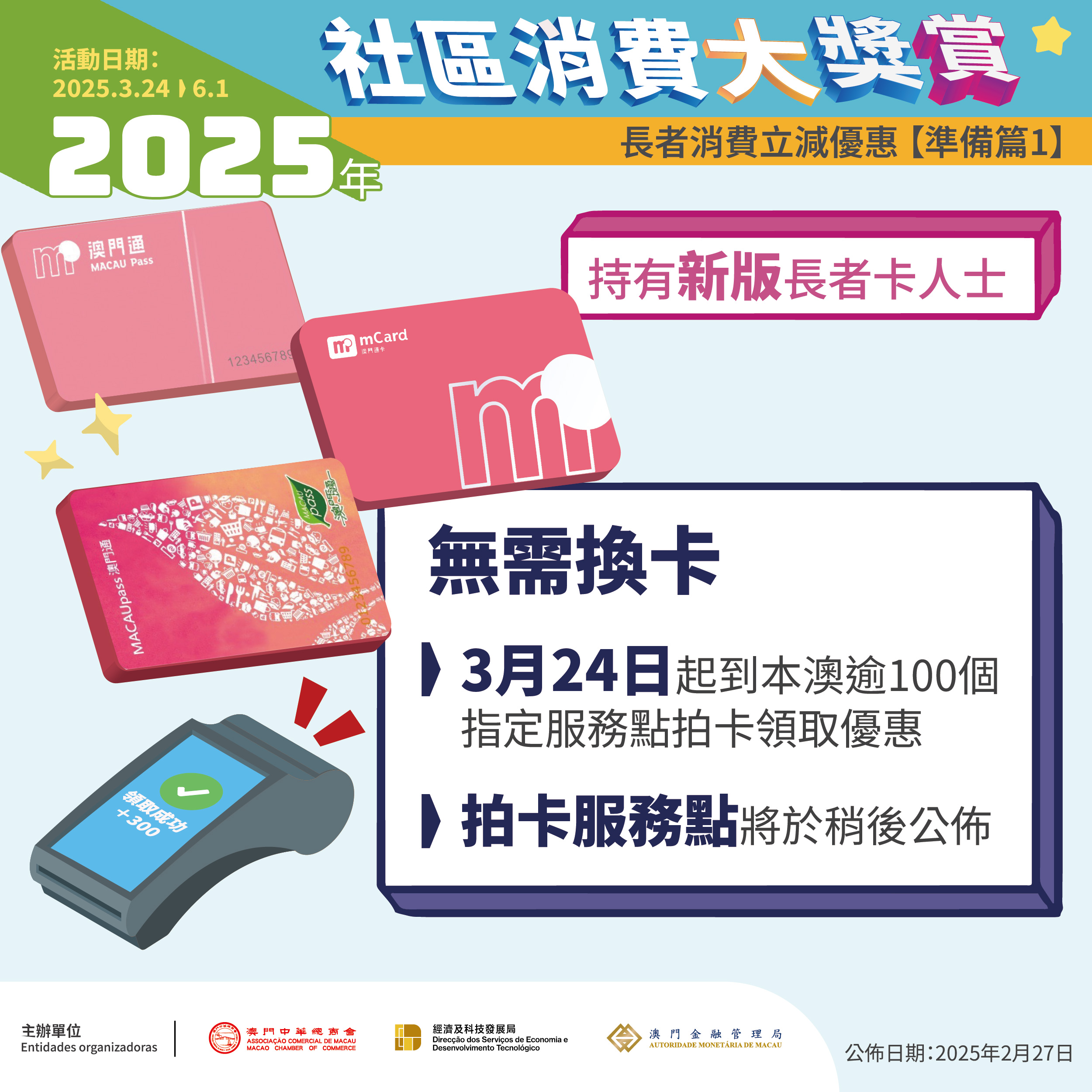 由特區政府與商會合辦的“2025年社區消費大奬賞”大型促消費活動將於3月24日至6月1日期間進行。為關顧長者,是次活動在過往手機支付消費後抽取電子優惠的基礎上,額外提供“長者消費立減優惠”,年滿65歲的長者在活動期間可憑新版“澳門通長者卡”拍卡領取總額300元的消費立減優惠。