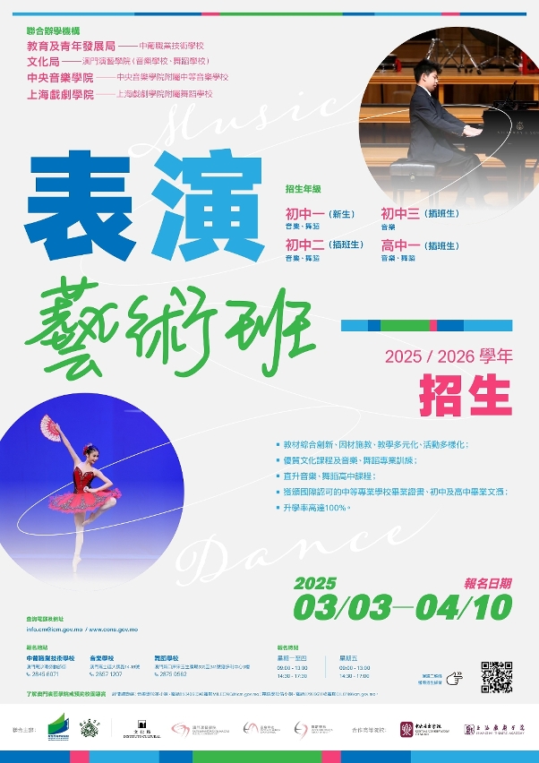 由文化局與教育及青年發展局聯合開辦的中學“表演藝術班”,將招收2025/2026學年初一年級新生,初二、初三及高一年級插班生,即日起至4月10日接受報名,歡迎對音樂、舞蹈表演藝術有興趣的學生報讀。