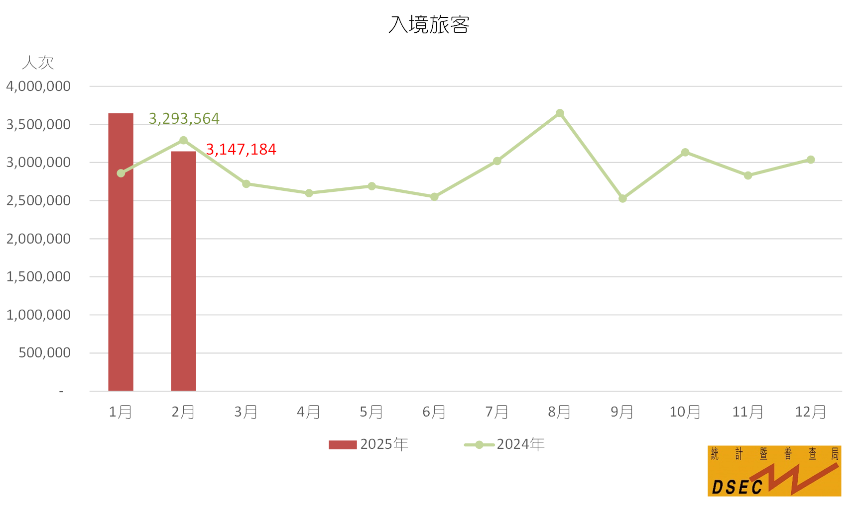 統計暨普查局資料顯示,2025年2月入境旅客共3,147,184人次,按年下跌4.4%,主要是去年2月中國內地8天春節假期帶動形成高比較基數所致。留宿旅客(1,259,358人次)較去年同期減少11.7%,不過夜旅客(1,887,826人次)則上升1.1%。旅客平均逗留時間為1.1日,按年持平;留宿旅客(2.2日)及不過夜旅客(0.3日)的平均逗留時間同樣維持不變。