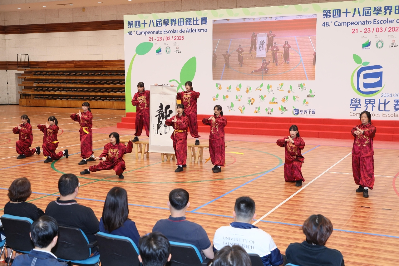 今屆學界田徑比賽進行了12個組別共127項賽事,閉幕儀式於2025年3月23日下午舉行。大會特別邀請蓮峰普濟學校龍獅隊進行表演。該校與本地的體育社團合辦了五屆“五節龍和擊鼓”聯校賽,讓學生共同學習中華傳統運動,弘揚和傳承中華文化,更在多項比賽中獲佳績,表演精彩。另一項表演由學界舞蹈比賽屢獲佳績的澳門中華總商會附設青洲中學進行街舞演出,街舞是受青年學生歡迎的舞蹈項目之一,融合舞蹈、武術和體操等不同動作,運動量十足,練習不受場地或天氣限制,藉表演鼓勵同學一同體驗和學習,更把現場氣氛推至最高。