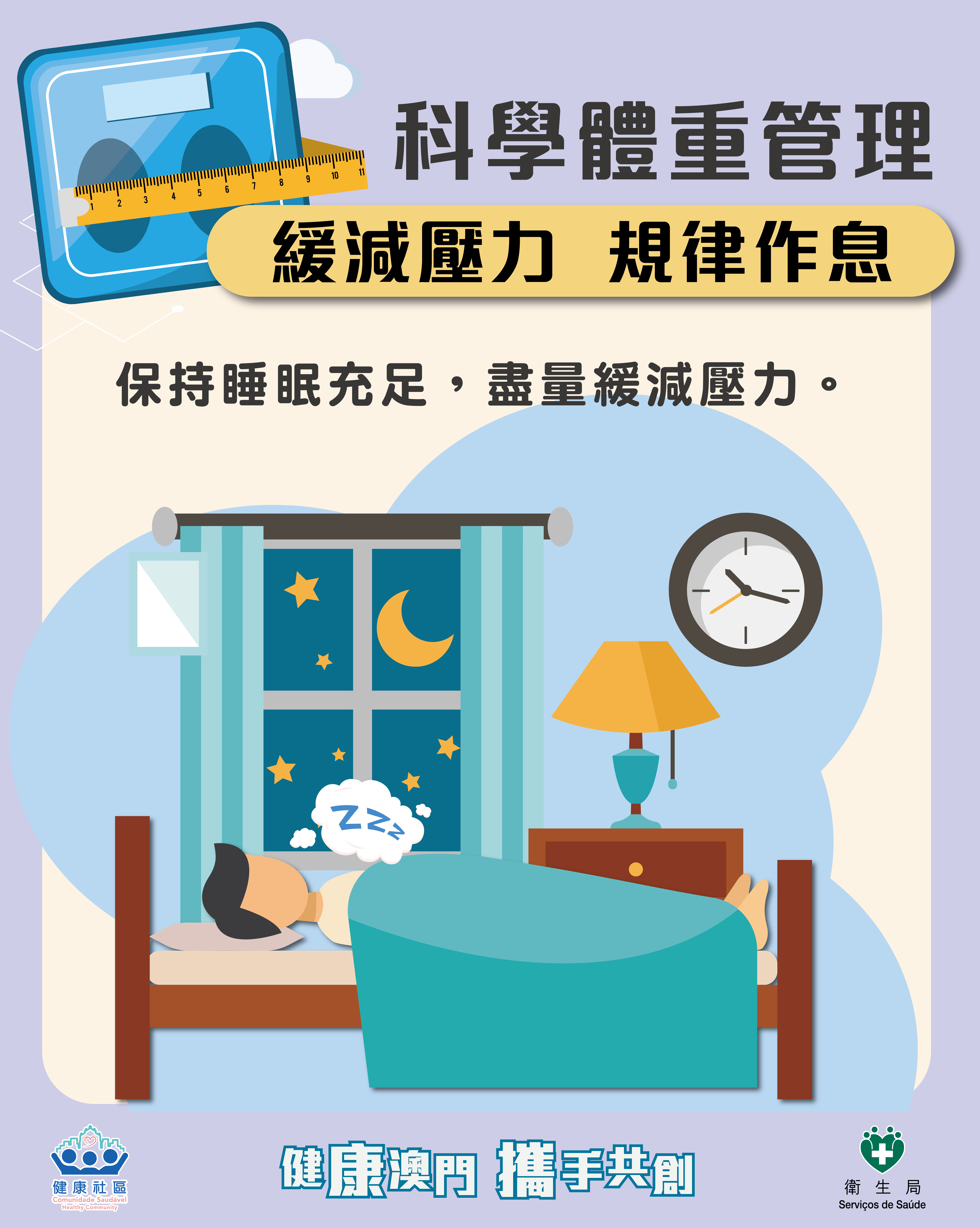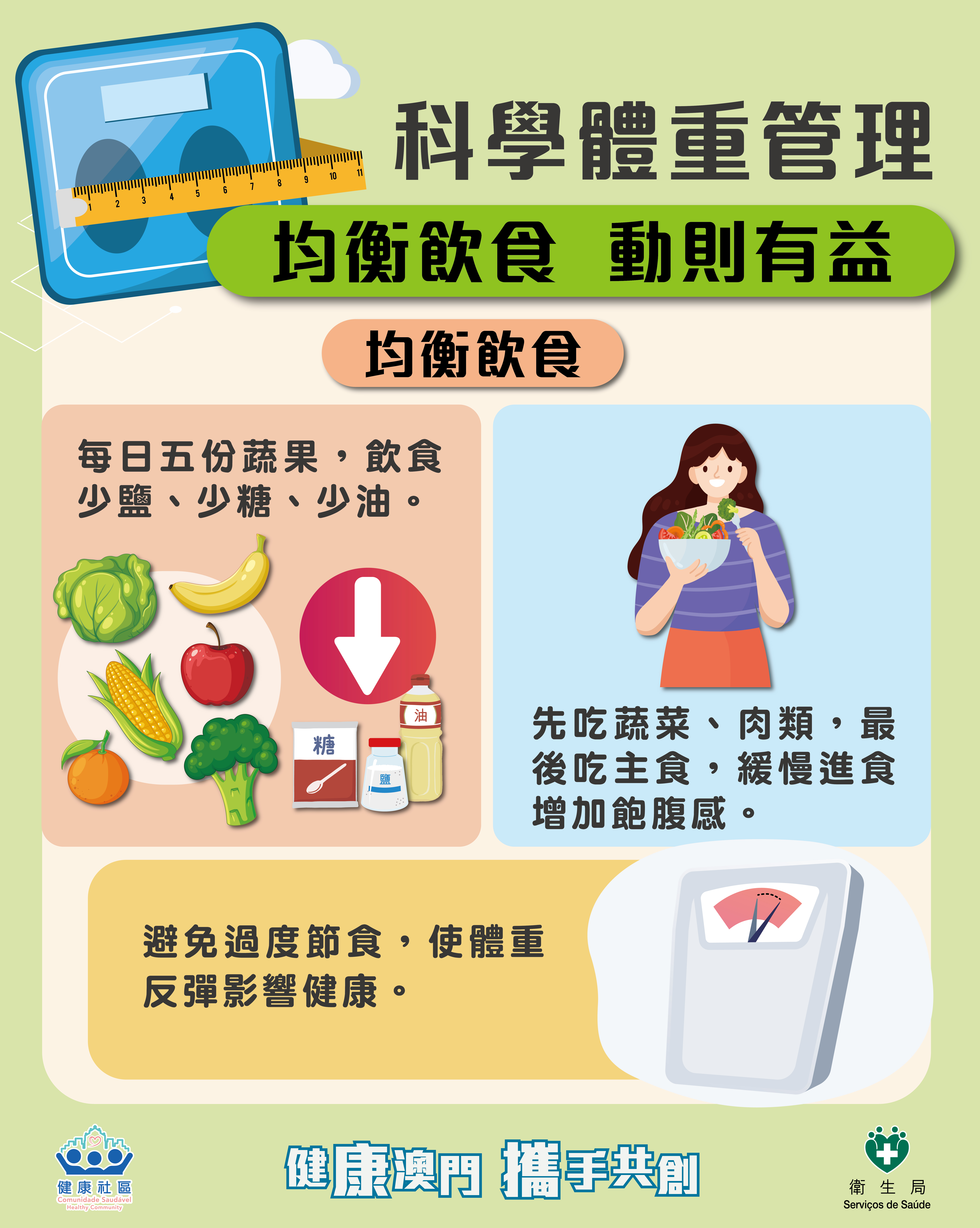超重及肥胖與高血壓、高血糖、高血脂等慢性病密切相關,是導致心腦血管疾病、糖尿病及部分癌症的重要風險因素。超重及肥胖對各年齡層人士的身心健康均可造成深遠影響,包括兒童期會引起早發性高血壓、孕期併發症風險增加,以及成年人慢性病發病率上升等。故此,需提升居民體重管理意識和技能,預防和控制超重肥胖。衛生局提出科學體重管理4大核心要點:定期測量,記錄評估、均衡飲食,動則有益、緩減壓力,規律作息、合理目標,科學減重。衛生局建議18歲或以上人士至少每年測量一次體重並計算體重指數(BMI),定期記錄健康數據;應均衡飲食,善用碎片時間進行運動;保持睡眠充足,盡量緩減壓力;設定可達成的目標,循序漸進,例如:每週減重0.5-1公斤,避免極端方式(請參閱“科學體重管理圖文包”)。