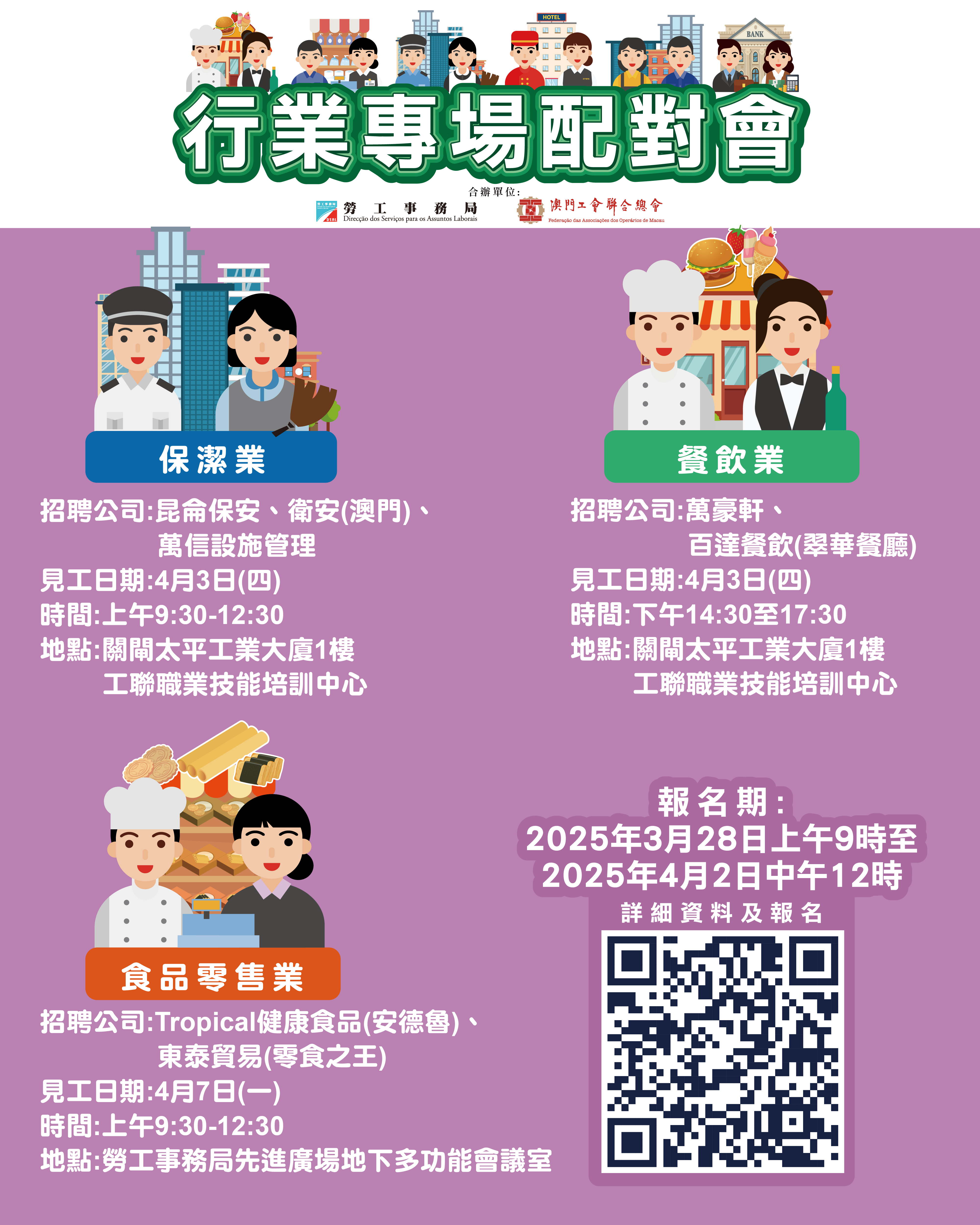 4月3日上午保潔業配對會及4月3日下午餐飲業配對會在澳門工聯職業技能培訓中心(關閘馬路101-105A號太平工業大廈第一期1樓)舉行;4月7日上午食品零售業配對會在勞工事務局地面層多功能會議室(馬揸度博士大馬路221-279號先進廣場大廈)舉行。報名期間為3月28日上午9時至4月2日中午12時。