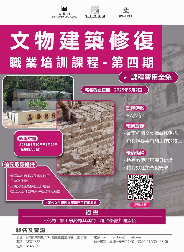 為促進澳門文物建築修復行業的技能發展及人才儲備,文化局、勞工事務局與澳門工程師學會於今年5月10日至6月22日期間續辦第四期“文物建築修復職業培訓課程”,費用全免,完成課程並通過考核之學員將獲發證書,歡迎現正從事或有興趣從事文物建築修復工作的澳門居民報讀。