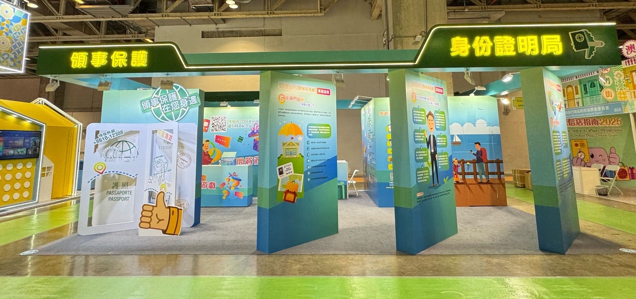 此外,身份證明局與外交公署合辦的展位設於會場B 區,編號 B8,展位包含不同元素,包括有領事保護資訊展覽、大型互動打卡裝置,以及有獎問答遊戲,獎品豐富,歡迎市民參與。