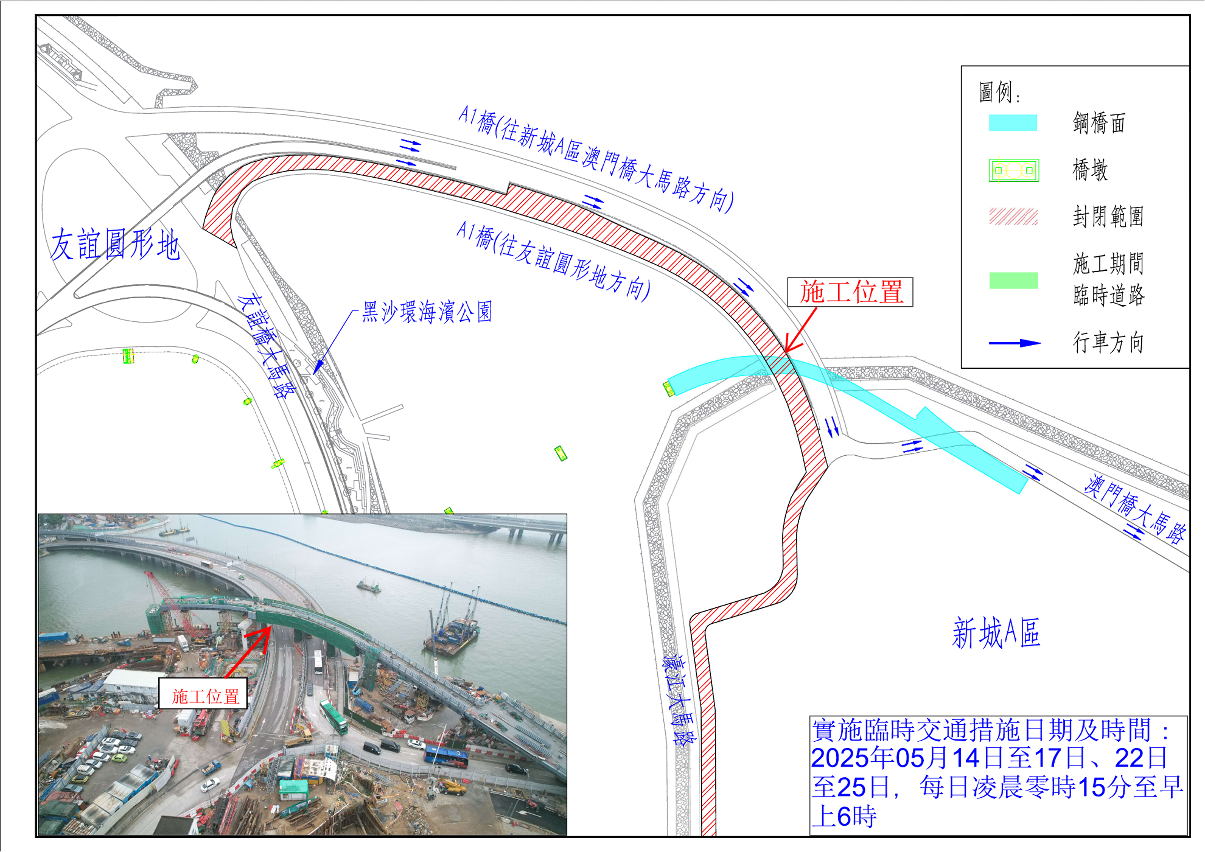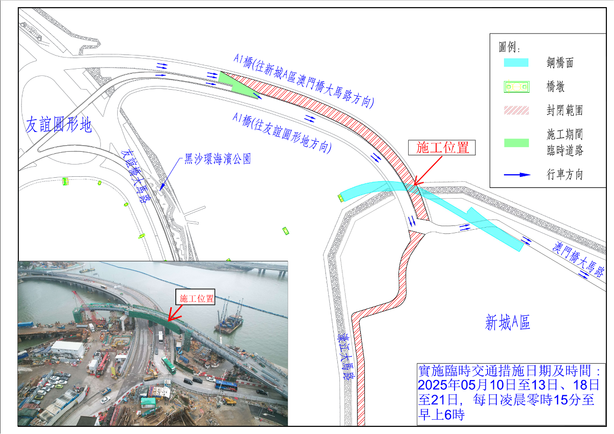 A1橋往新城A區澳門橋大馬路方向行車路線不變;A1橋往友誼圓形地方向實施封閉交通,由新城A區前往黑沙環區之車輛,僅可經濠江大馬路取道A2橋前往馬揸度博士大馬路。 |