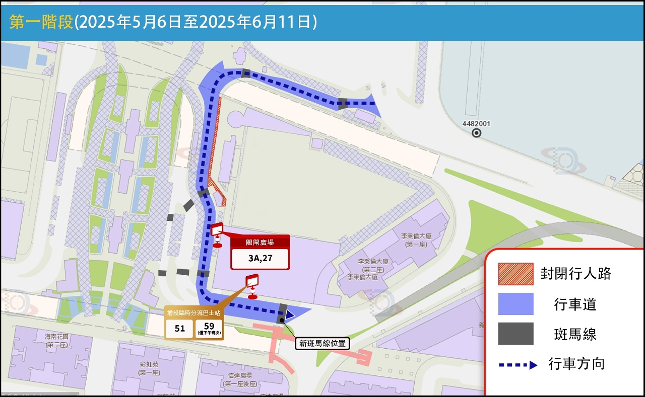 配合第一階段施工,5月6日上午10時至6月11日,關閘廣場實施有限度通車,禁止車輛停泊關閘廣場近關閘特警總部的路段以用作設置臨時巴士站,同時臨時停用關閘廣場近關閘特警總部之斑馬線,以及新增一條臨時斑馬線,以便利行人過路。巴士方面,為維持候車秩序,51及59(僅下午班次)路線調整往原關閘特警總部大樓入口的臨時分流站(近行人天橋),而原關閘廣場巴士站(M9)則繼續供3A及27路線停靠。