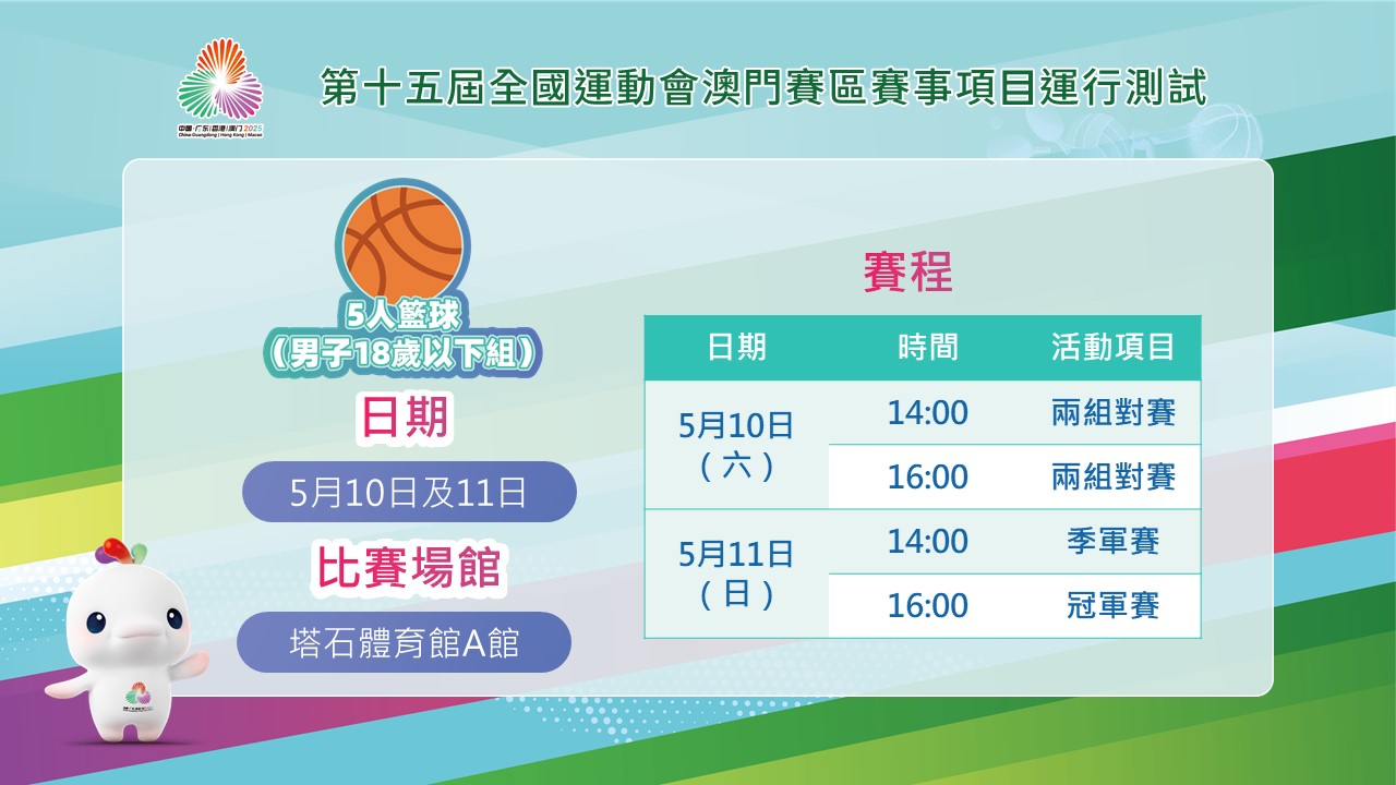 為了對賽事運行的各個環節進行檢視和優化,十五運會及殘特奧會澳門賽區籌備辦公室將在5月及6月舉行十五運會5個比賽的項目運行測試,當中,5人籃球(男子18歲以下組)將率先於本週末(5月10及11日)下午兩時在塔石體育館A館舉行,來自澳門、珠海、中山、江門的球隊將抽籤分成兩組對賽,賽事將開放予市民及旅客入場觀賞,提前感受全運會盛事的氣氛。