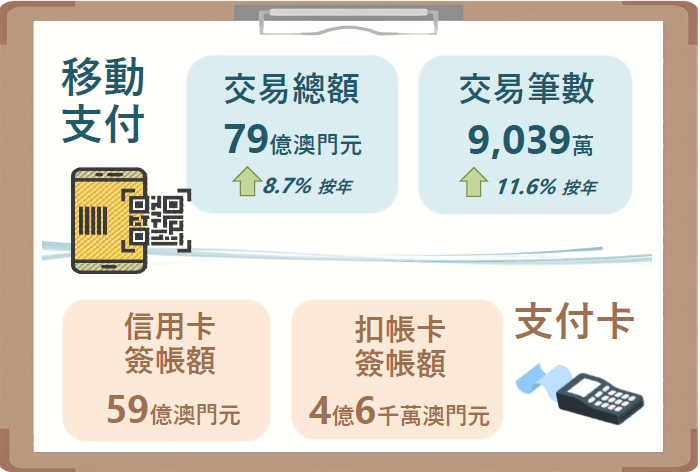 本地移動支付工具於2025年第一季的交易筆數為9,039萬宗,按年增加11.6%;交易總額為79億元(澳門元,下同),按年上升8.7%,每筆交易的平均金額為87.8元。截至2025年3月底,本地受理移動支付的機具及二維碼立牌數量為108,749個。
