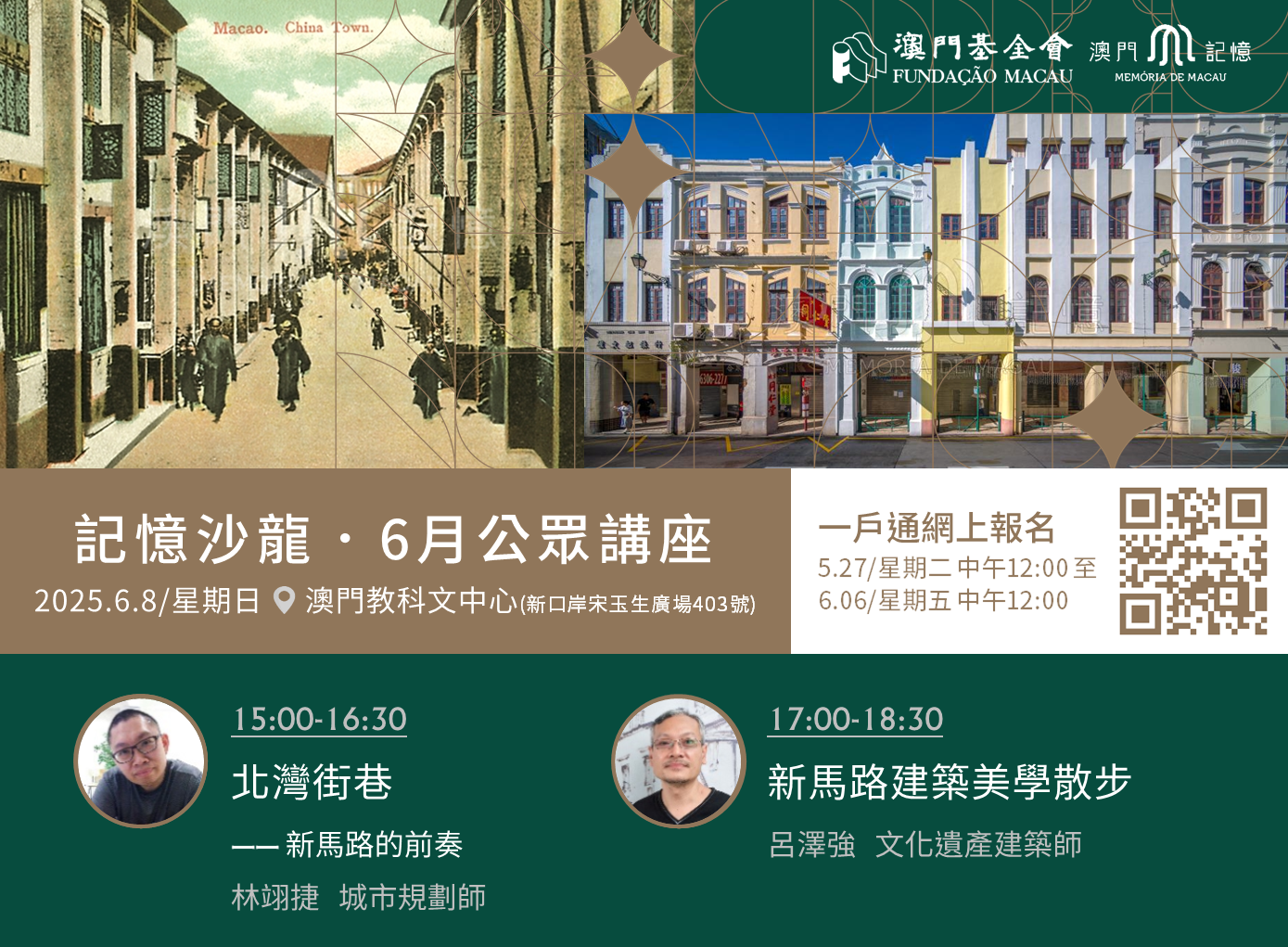 首兩場“記憶沙龍”公眾講座將於6月8日(星期日)下午於澳門教科文中心舉行,分別由城市規劃師林翊捷於3時至4時半主講“北灣街巷──新馬路的前奏”,以及文化遺產建築師呂澤強於5時至6時半主講“新馬路建築美學散步”,帶領市民細味新馬路的前世今生,感受澳門城市發展與文化保育的深層魅力。