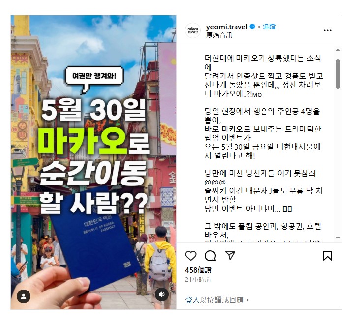 旅遊局將於5月30日至6月2日在韓國首爾舉辦“感受澳門”路展活動。活動延續“My Favorite Macao”主題,透過沉浸式互動體驗和線上線下聯動推廣,全方位展現澳門“旅遊+”多元魅力,激發韓國旅客尤其千禧及Z世代年輕客群在暑假及下半年到澳門旅遊及消費,鞏固澳門目前最大國際客源市場。