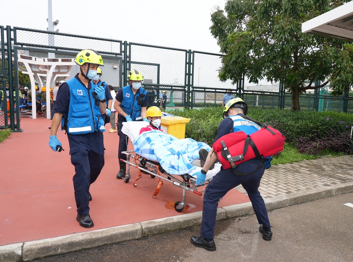 消防局接報後,隨即派遣6輛緊急車輛及28名隊員趕赴現場,並按照既定行動預案開展處理洩漏及疏散救援行動工作。消防人員於現場探測到有天然氣洩漏,並射水進行保護,進入洩漏位置關閉肇事天然氣調壓管道總掣。同時,救護員在疏散集合點清點人數,並對一名員工在疏散途中受傷的員工進行護理後模擬送院治理。