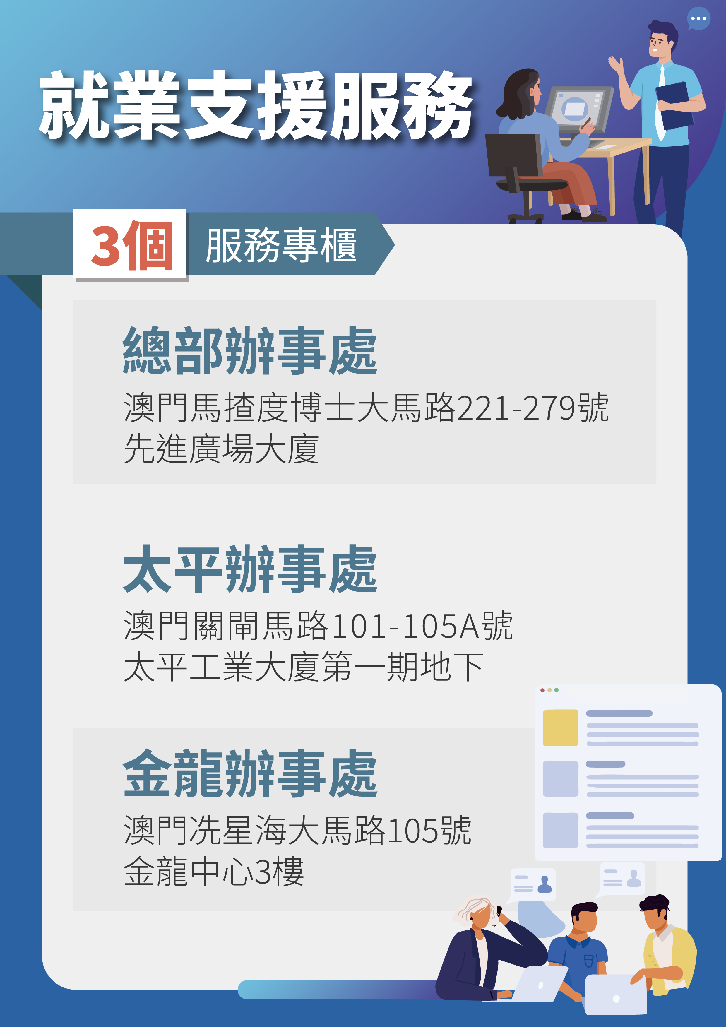 特區政府已因應啟動多個方面的工作。其中,勞工事務局今天已派員前往“衛星場",從旁參與博彩承批公司與“衛星場"場主人力資源部門與員工的會議,提供勞動法例諮詢等協助。此外,勞工事務局已開通多條電話專線(2842 0992、28717810),並在總部辦事處、太平辦事處及金龍辦事處設置專櫃為員工提供一站式服務,同時將舉辦勞動權益講解會等,多措並舉,務求全方位協助受影響的就業居民。