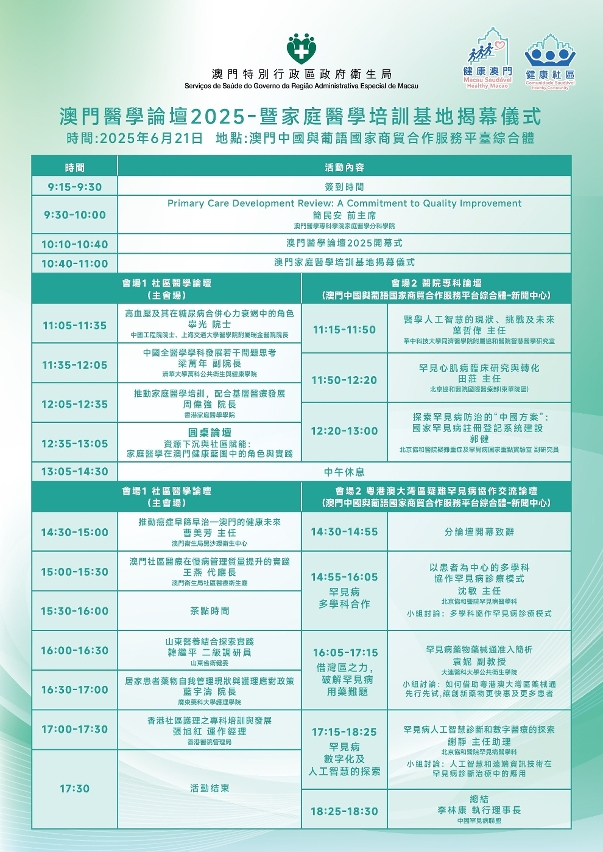 為落實《健康澳門藍圖》所訂定的總體目標和指標,積極推動“健康社區”計劃,貫徹資源下沉至社區,擴大社區醫療效能,提升本澳醫療人員的專業素養及臨床實踐技能,推動本地醫療技術進步(詳情可參閱海報)。衛生局於6月21日(星期六)舉辦“澳門醫學論壇2025暨家庭醫學培訓基地揭幕儀式",論壇特邀多名來自內地、香港地區及本澳的權威醫學專家,透過專題演講及互動交流,為與會者帶來嶄新的醫學知識與實踐經驗。是此活動已納入持續專業發展(CPD)計劃,對象為本澳醫療人員,費用全免,歡迎報名參加,詳情如下: