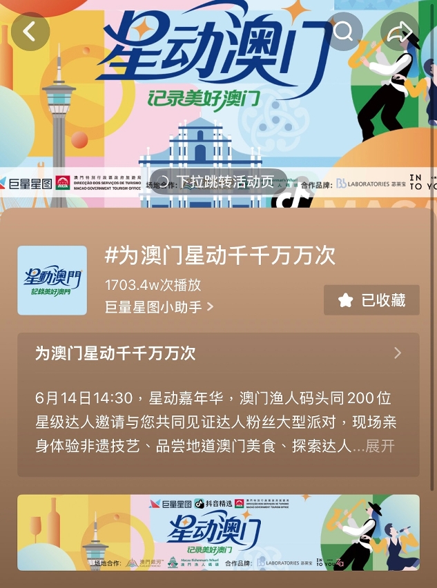 此外,“星動澳門”大型活動前期宣傳已全面鋪開,包括發佈官方預熱視頻及發起創作者話題活動,號召全網用戶跟隨達人前往探索澳門;多位達人亦發佈預熱視頻號召粉絲到澳門旅遊及參與活動。歡迎旅客和居民關注澳門特區政府旅遊局官方抖音帳號了解活動詳情。