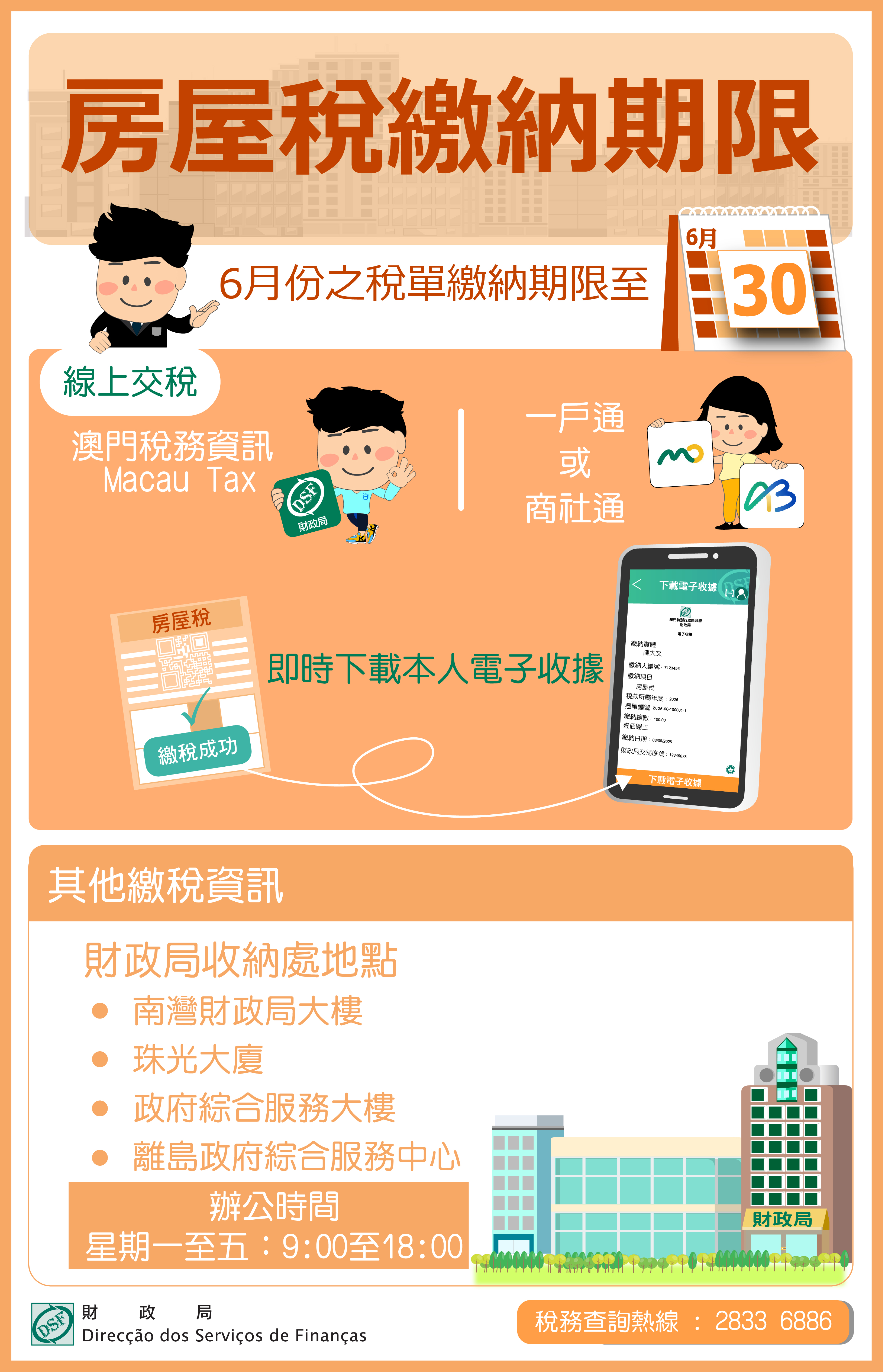 財政局提醒房屋稅納稅人,2024年度房屋稅徵稅憑單上繳納月份屬6月的房屋稅,繳納期限至6月30日屆滿,仍未繳納上述房屋稅的納稅人應儘快繳納,避免因逾期繳納而須附加過期利息和罰款。