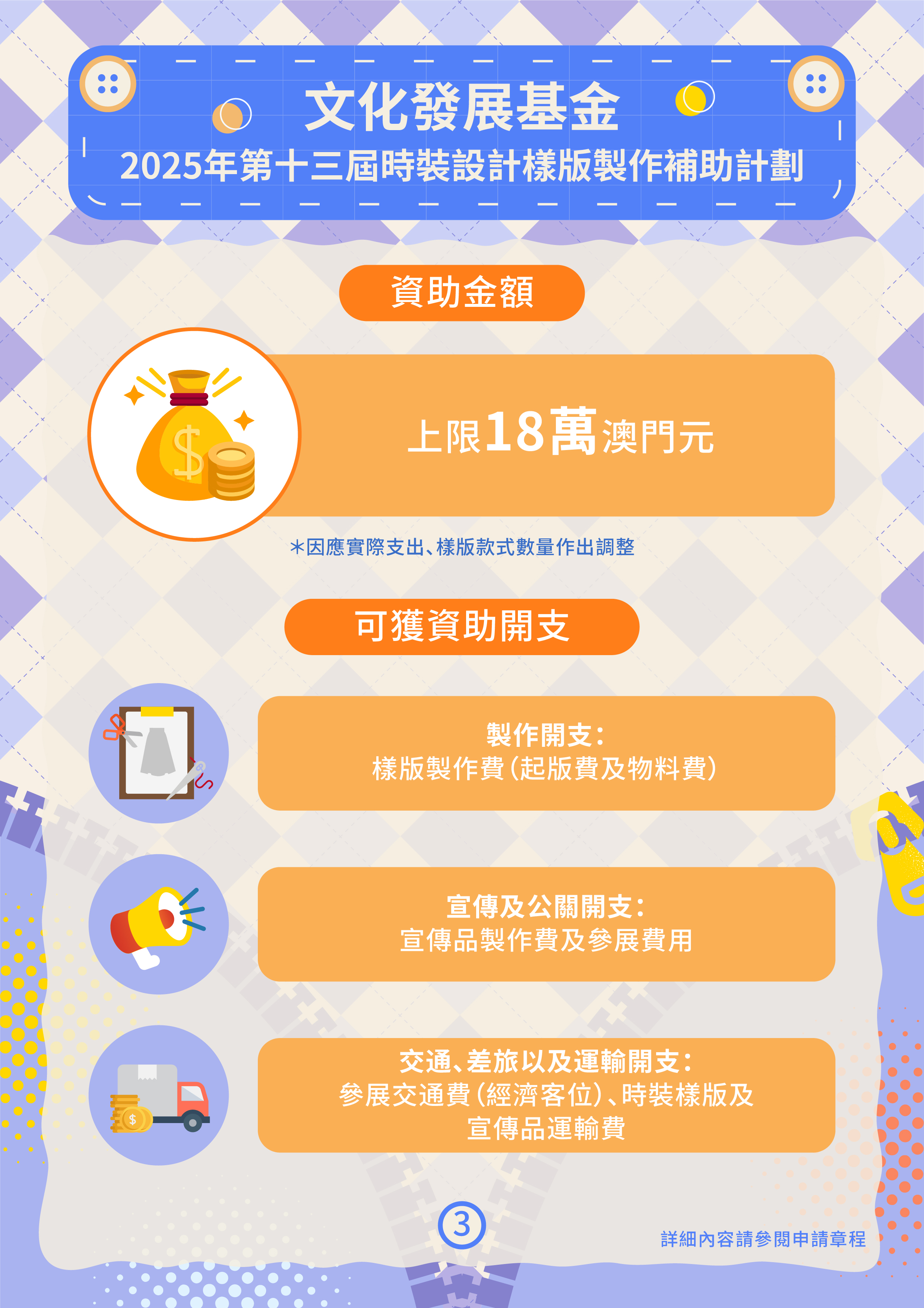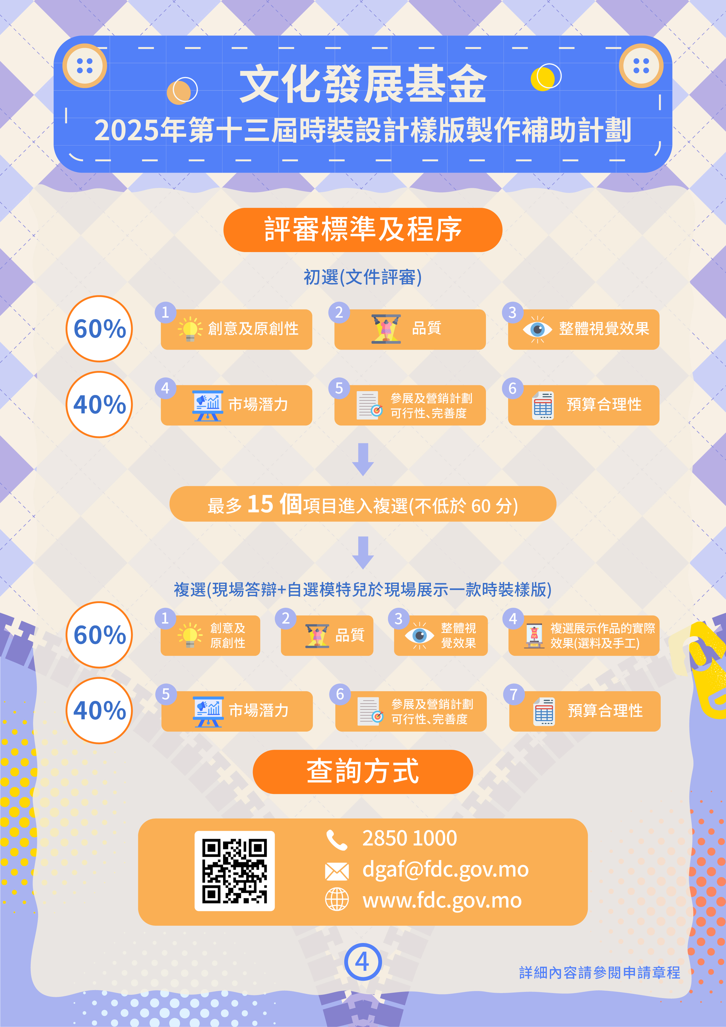 文化發展基金將於6月24日至8月1日接受“第十三屆時裝設計樣版製作補助計劃”的申請,為本地時裝設計師的原創時裝系列作品的樣版製作及宣傳推廣提供支持,持續推進澳門時裝設計行業發展。