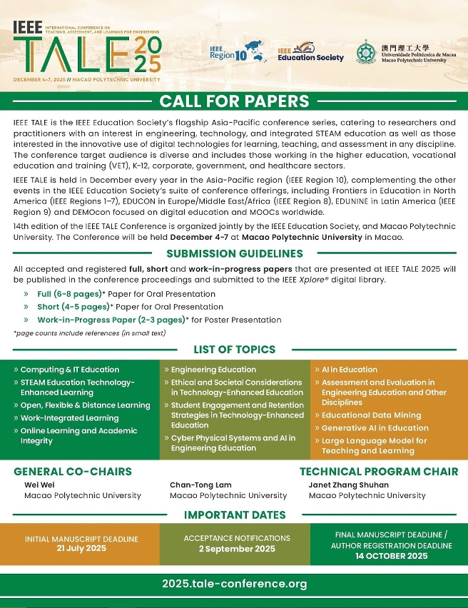 歡迎全球學界與業界專家踴躍投稿,齊聚澳門,共同探索教育科技的未來,投稿截止日期為2025年7月21日。投稿連結:2025.tale-conference.org/authors/call-for-papers,更多資訊請查閱網站:2025.tale-conference.org。