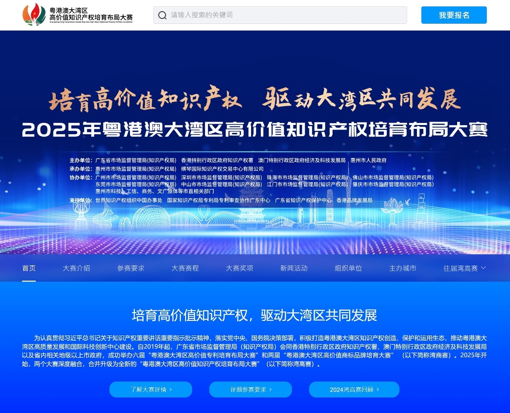 “粵港澳大灣區高價值知識產權培育佈局大賽”是粵港澳三地在知識產權領域攜手推進大灣區建設的重大品牌活動,不但為參加者提供展示及交流合作平台,參賽項目更可享有大灣區九市政策扶持及資源對接服務,助力項目落地發展。本屆大賽設金獎10項,銀獎20項,優秀獎30項。此外,還設有投資潛力獎、轉化運用獎、網絡人氣獎等專項獎勵50項。大賽報名截止日期為2025年8月15日,歡迎各類創新主體及商標品牌積極參賽。