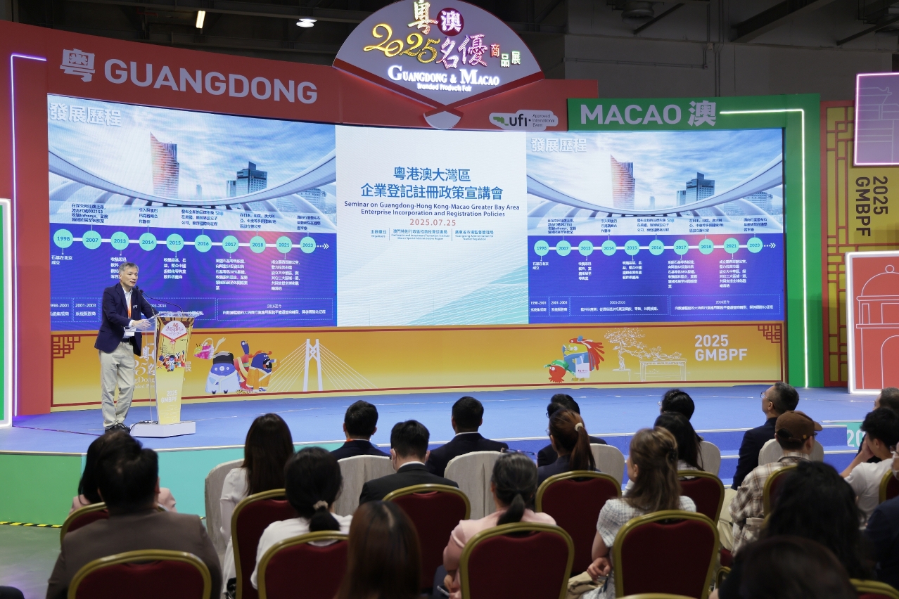為協助本澳企業深入瞭解粵港澳大灣區企業登記註冊相關政策及流程,更好把握大灣區發展機遇,由澳門特別行政區招商投資促進局聯合廣東省市場監督管理局主辦的“粵港澳大灣區企業登記註冊政策宣講會”,今( 25) 日在“2025 粵澳名優商品展”期間舉行。活動吸引近80名澳門企業代表參與。當中有橫琴粵澳深度合作區澳資企業分享使用澳門招商局服務,及透過相關便利措施成功落戶合作區的經驗。