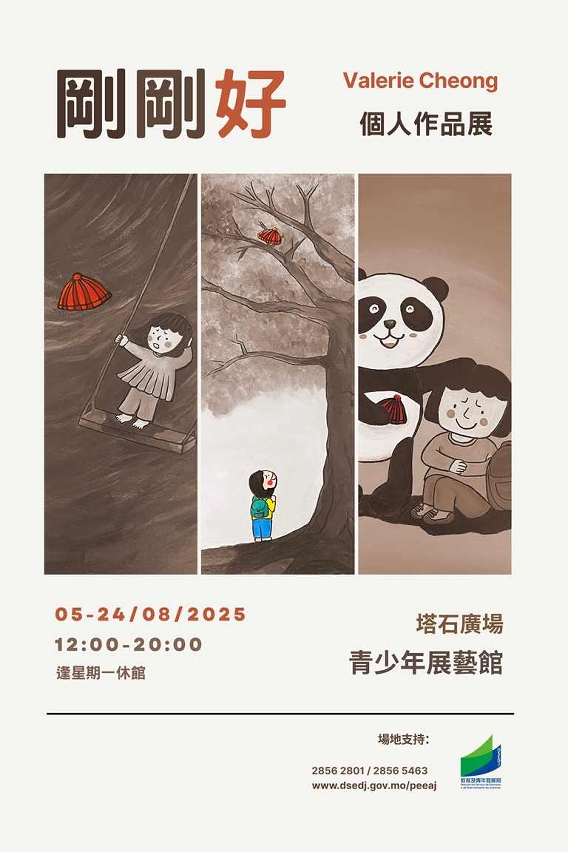 教育及青年發展局轄下青少年展藝館將於2025年8月5日至8月24日展出“剛剛好”── 青年藝術愛好者張慧麗個人作品展。展覽名稱“剛剛好”是表達足夠就是最好,展品內容是30幅以丙稀、水彩、木顏色為媒材的手繪作品和一繪本,畫作共分三個主題,包括迷失、發現、和解,主要表達成長不同階段的日常情境和心情寫照。作者冀透過展覽回顧過去,並以新角度看待將來。