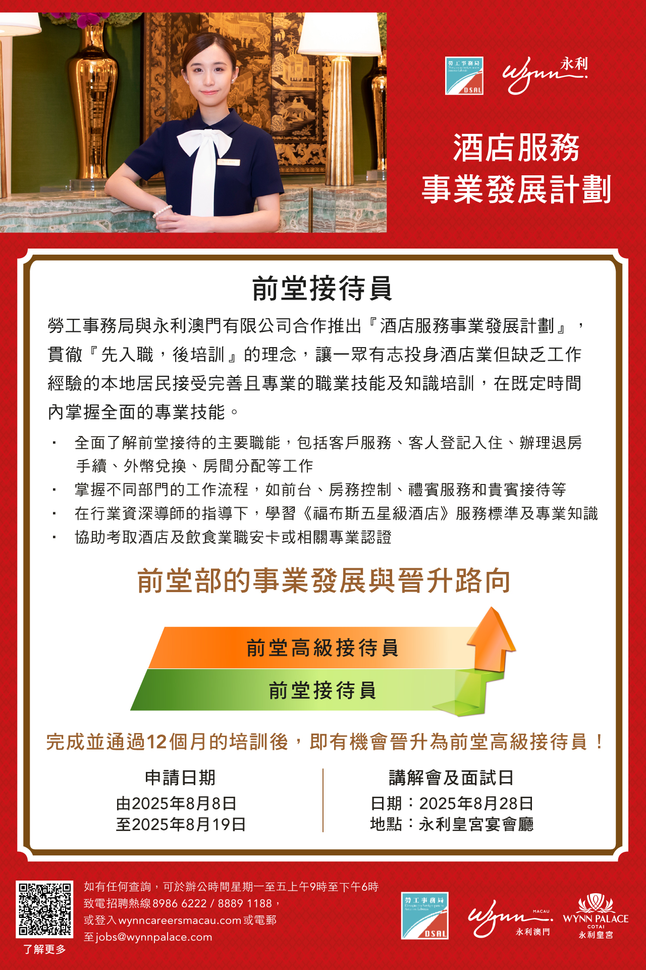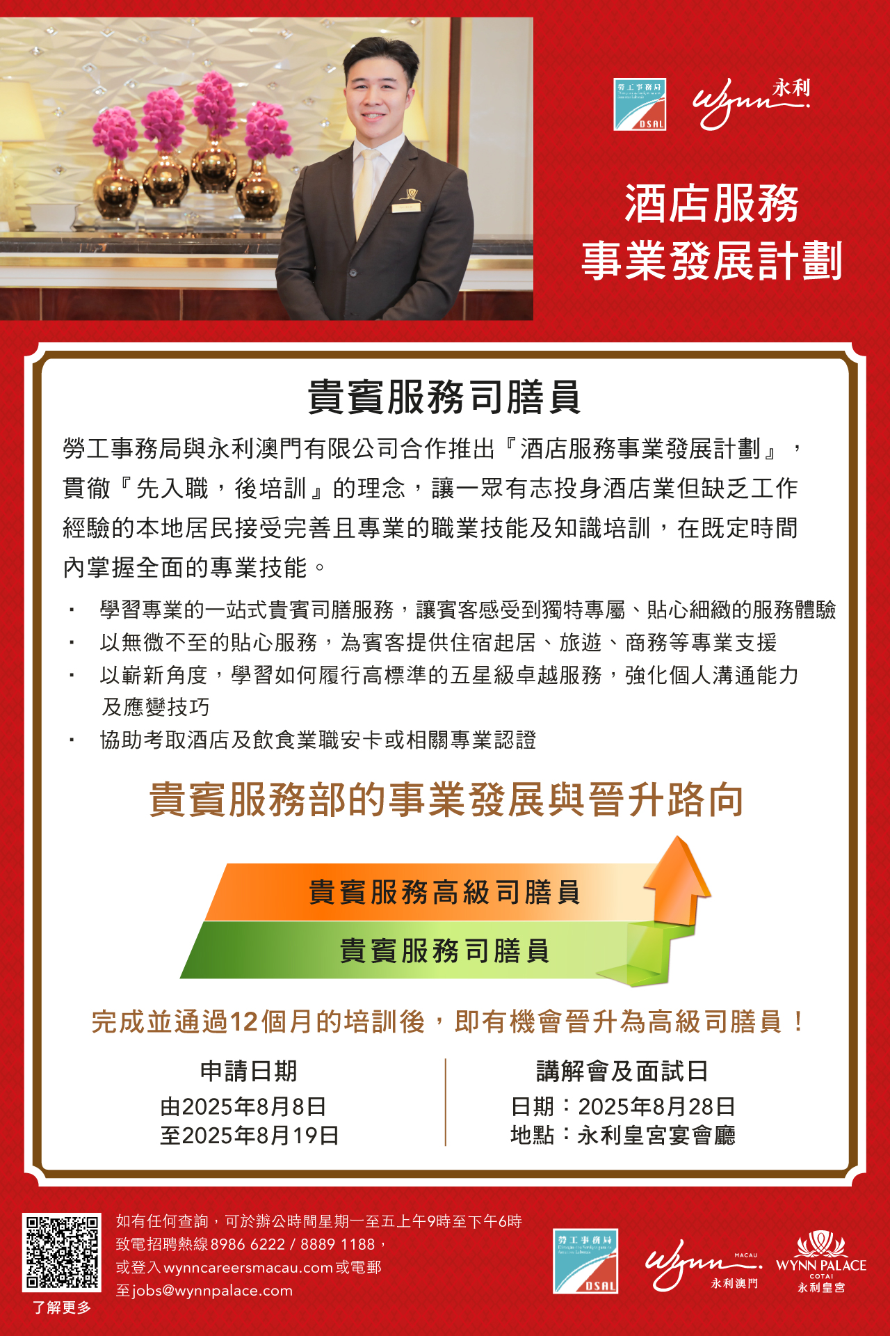 為培育本地人才,提供職業發展機會,勞工事務局(下稱勞工局)和永利澳門有限公司(下稱永利)合作推出“永利酒店服務事業發展計劃"(下稱計劃),以“先入職、後培訓"方式,為有志投身酒店服務範疇的澳門居民,提供一系列的專業培訓及工作實踐,計劃由8月8日起接受申請。