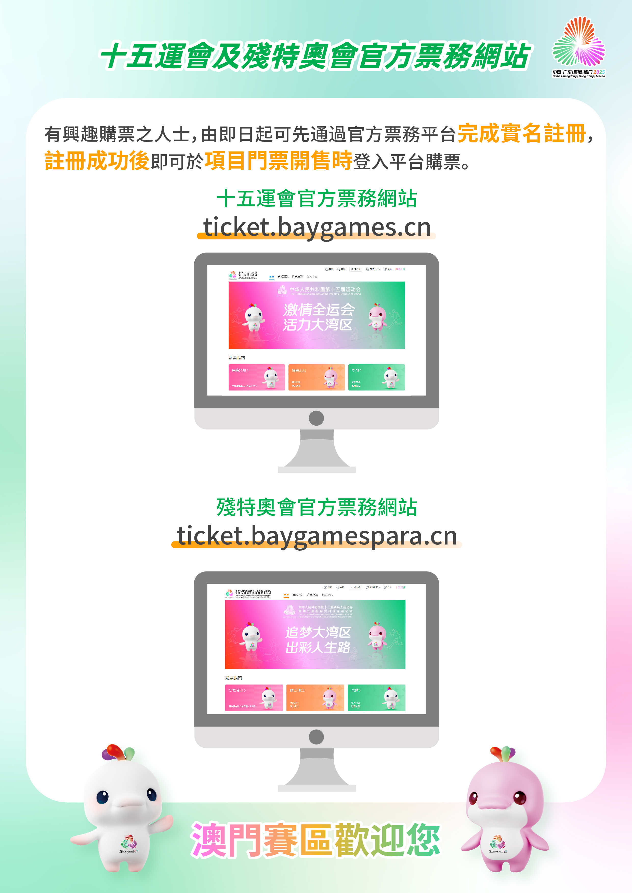 第十五屆全國運動會及全國第十二屆殘疾人運動會暨第九屆特殊奧林匹克運動會(下稱“十五運會和殘特奧會”)將於本年11月、12月在粵港澳三地舉行。澳門將會承辦十五運會的乒乓球、3人籃球、5人籃球(男子18歲以下組)、排球(女子成年組)及空手道5個項目,以及殘特奧會2個羽毛球項目。各賽區的項目賽事門票將根據競賽安排分階段、分批次銷售。有興趣購票之人士,必須通過官方票務平台完成實名註冊,註冊成功後再於項目門票開售時登入平台購票。